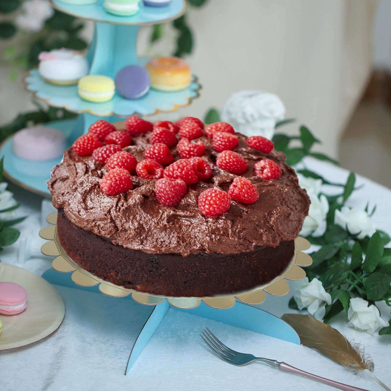 1-Tier Cardboard Cake Stand Light Blue - Stylish Reusable Cupcake Dessert Holder with Gold Scalloped Rim for Baby Showers Birthdays & Events 13"