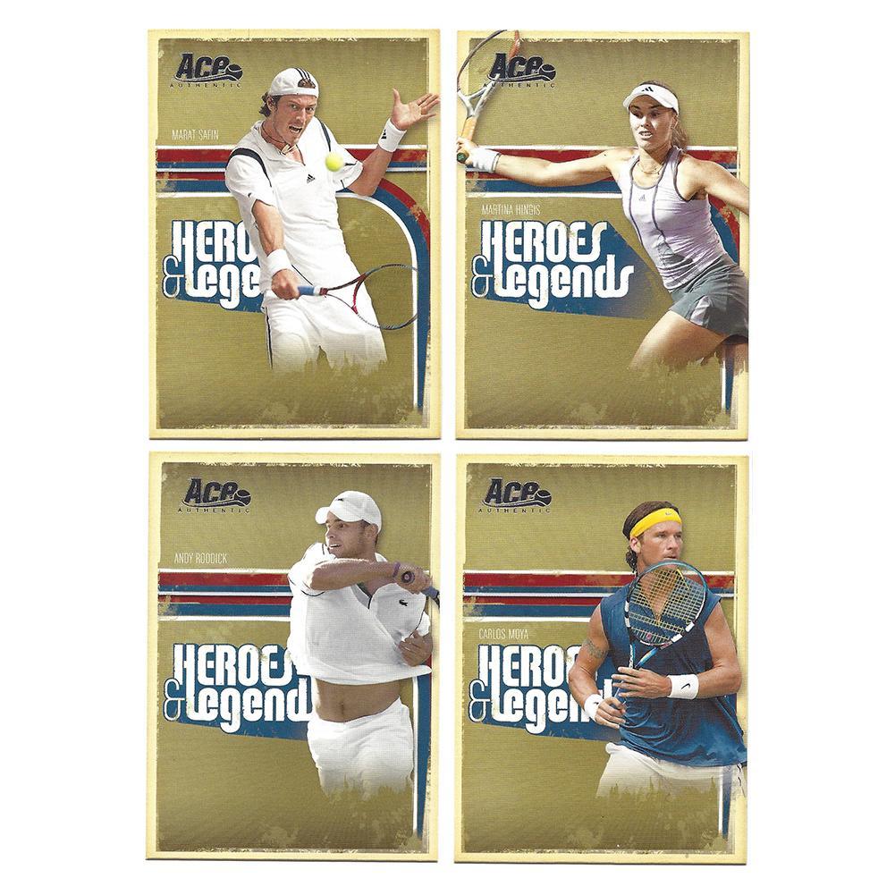 The Ace Authentic Heroes & Legends Tennis Trading Card Set contains the complete set of 99 cards of players on tour from 2006. This exclusive product contains players such as Federer, Nadal, Roddick, Agassi, Blake, Clijsters, Davenport, Hingis, Jankovic, Myskina, Safin, Sharapova, Moya, Henman, Bryan Brothers, Jankovic, Monfils and many more. There are also randomly inserted Autograph and Jersey Cards of players like Federer, Nadal, Sharapova, Roddick, etc. These Ace Authentic Tennis Trading Card Heroes & Legends Factory Sets will be SOLD OUT soon, so order yours today.