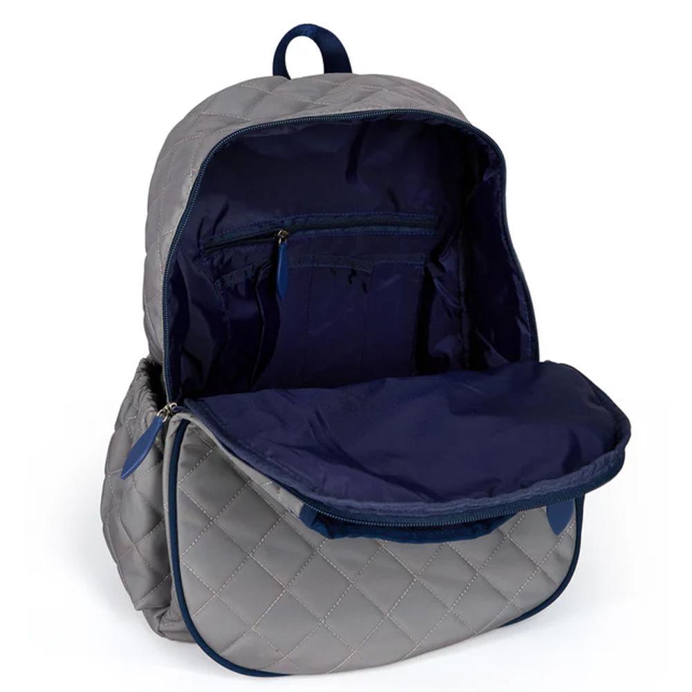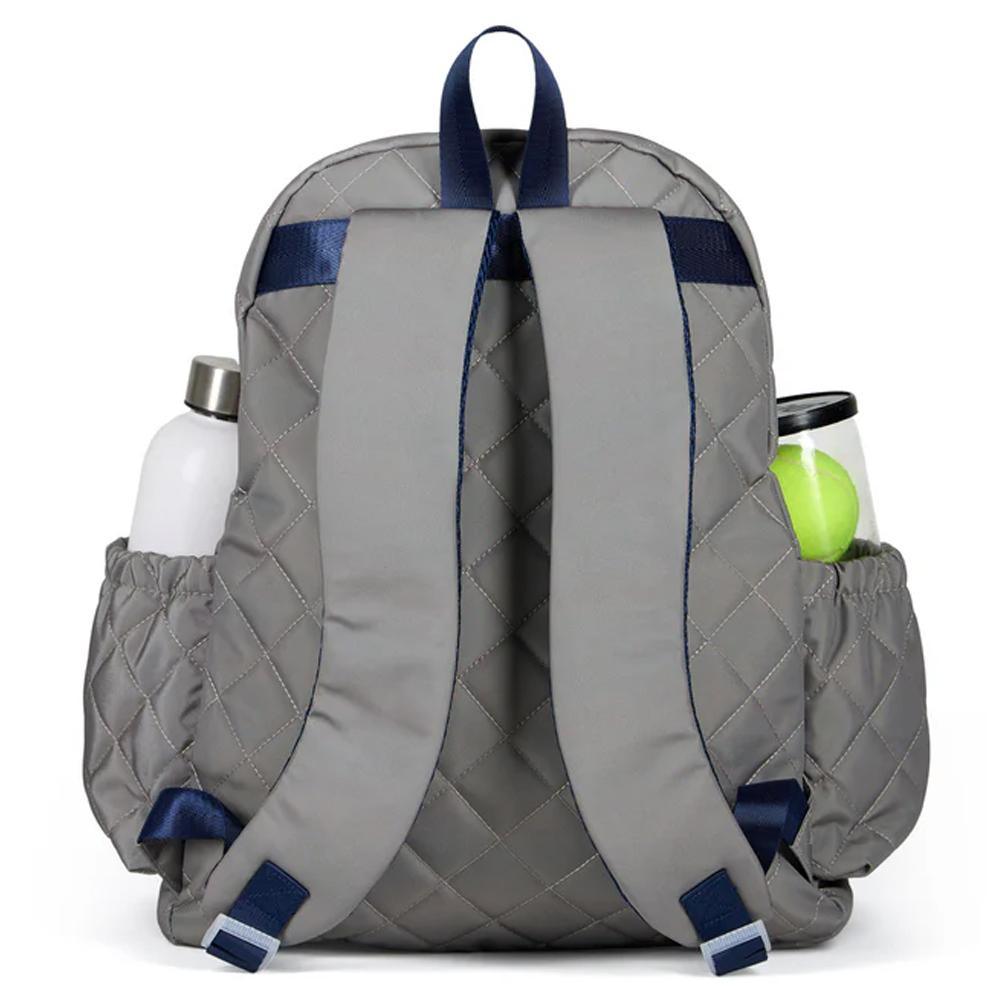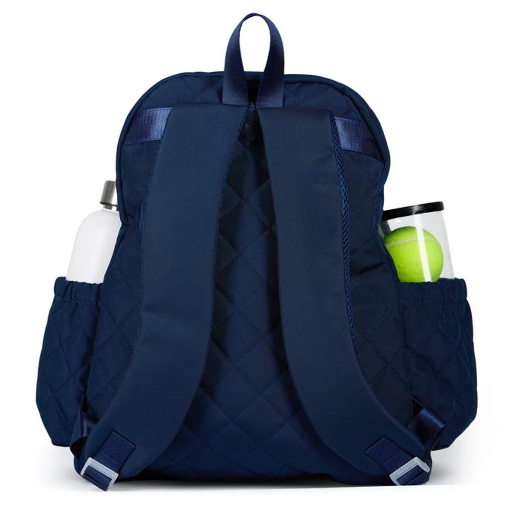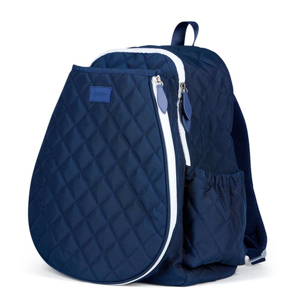 Stay organized with the Ame & Lulu Women's Game On Tennis Backpack. This fashion forward backpack, available in a variety of fun prints, is made out of a lightweight, sturdy nylon giving it plenty of durability. There is extra padding in the back for better structure and comfort while the straps make it easy for carrying. There is a large zippered central compartment to store your basic tennis needs, a zippered back compartment to store up to 2 frames as well as two side slip pockets for water or a can of balls.