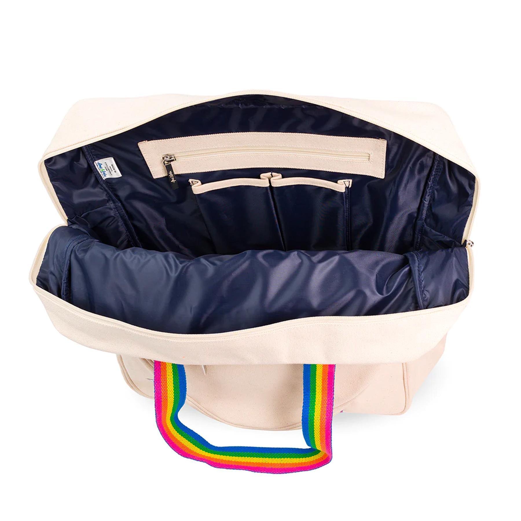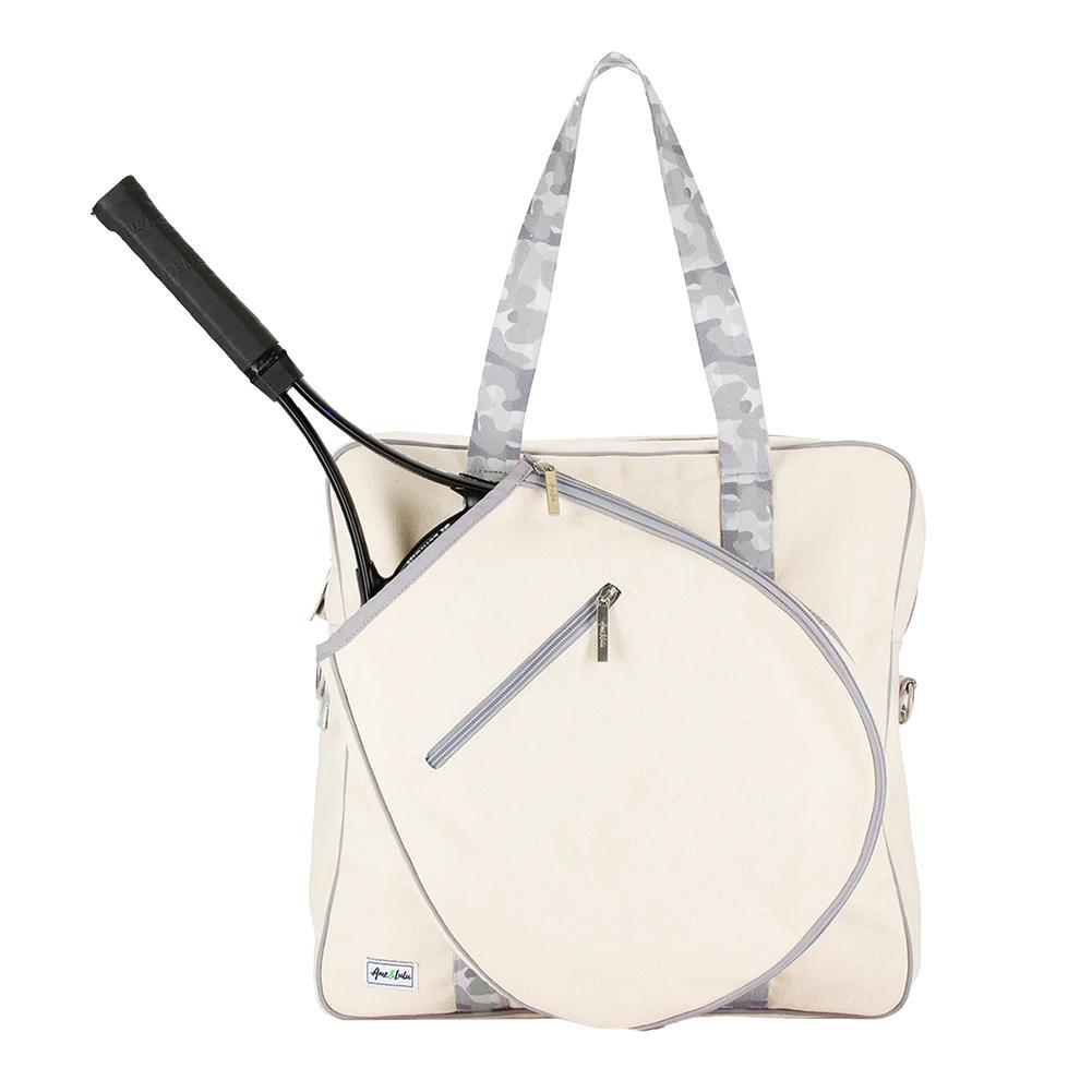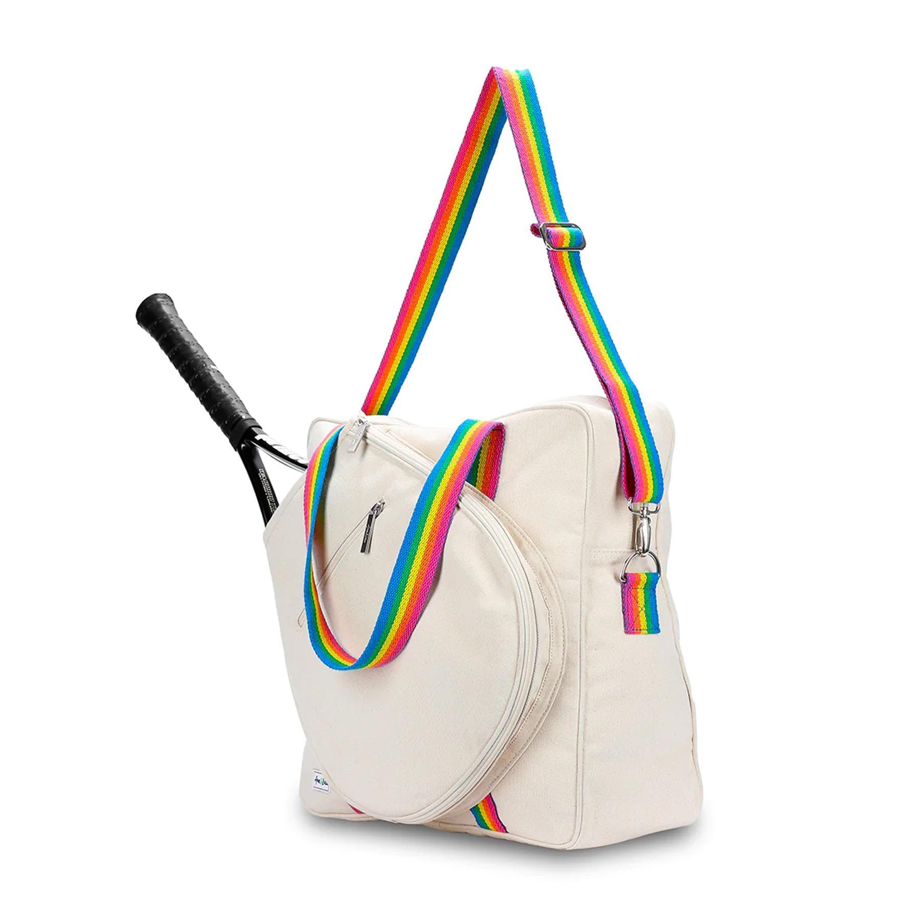 The Ame & Lulu Women's Hamptons Tennis Tour Bag is the ultimate bag for tennis players keen to make a statement on and off the court. It features a sturdy canvas exterior with a zip closure, a removable and adjustable shoulder strap with a 10" drop, and multiple interior and exterior pockets. An exterior zippered compartment fits two racquets.