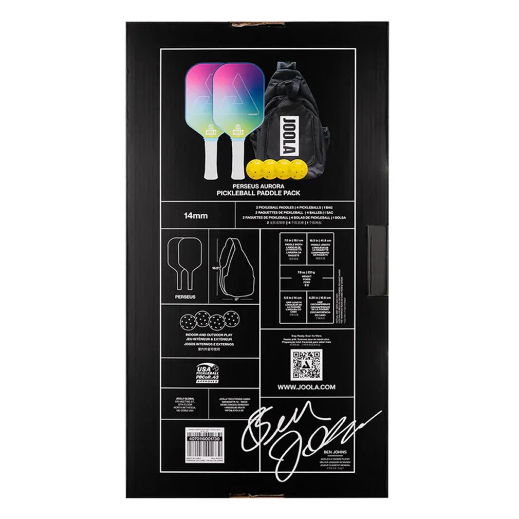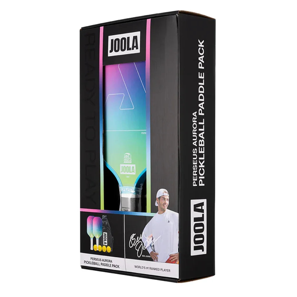 Get started on your pickleball journey with the Joola Aurora Pickleball Paddle Pack! This starter set comes with 2 easy-to-use, high-quality Perseus pickleball paddles for you and a friend to use on the courts. They're NFC-enabled to sync with the Joola Connect app, which provides tips for beginners and more. Comes with 4 Primo indoor pickleballs and a sling bag to carry everything.