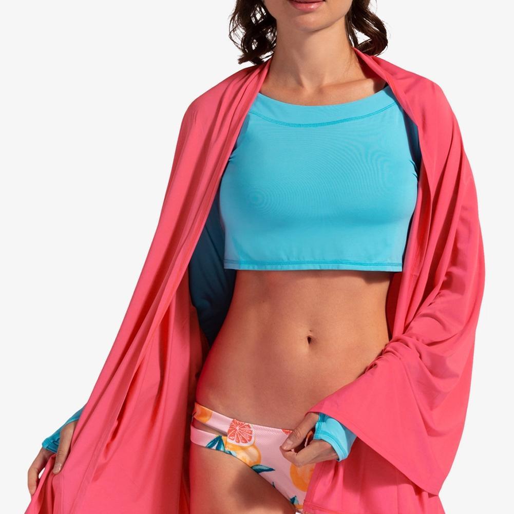 Add some flair to your outfit with our BloqUV Unisex Sun Protective Blanket Wrap in Watermelon. This stylish wrap is super soft and lightweight making it a portable and versatile SPF coverup. You can use it as a sun wrap, shawl, beach scarf, or a stroller cover and baby wrap. The limit to this protective wrap is only your imagination. Built with UPF 50 + and lab tests have shown it blocks 98% UVA/UVB rays. It is also equipped with moisture-wicking and quick-drying technology. Plus it is made with shrink-resistant fabric and is odor-resistant. This is the perfect chemical-free sun protection for the summer months ahead!