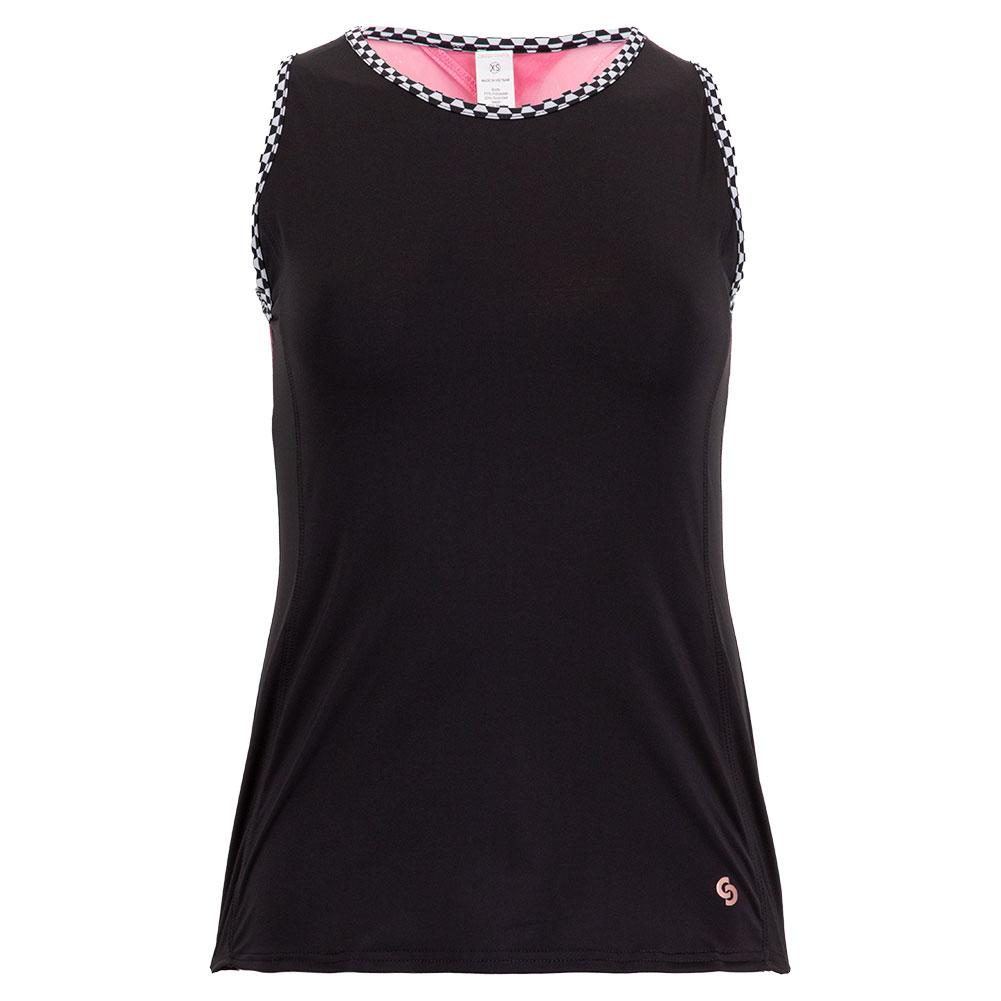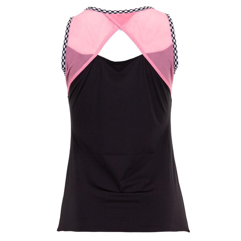Court style never looked so good. Take a look at our Cross Court Women's Palm Springs Tennis Tank Black. This tennis tank top has a lot to offer with its high neckline and carnation pink mesh paneling in the back. It also has criss-cross back detail that peeks through the opening in the pink mesh panels. This semi-fitted tank is equipped with UPF 50+ protection and sweat-wicking technology to keep you comfortable and protected against the sun's rays while you play. It also has a scoop neck with accent trim around the neckline and armholes.