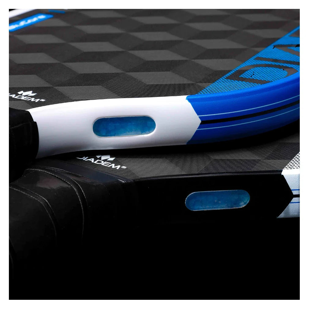 Innovate your game with the Diadem Edge BluCore Pro 14mm Pickleball Paddle. The Pro model features an elongated shape for maximum hitting power, with the 14mm core adding more pop to each hit. Thanks to its namesake foam BluCore construction, this paddle offers superior dwell time to generate spin while also boasting a larger sweet spot. An EVA foam ring also improves swing and twist weight to allow more stability. Compared to polypropylene cores, the foam BluCore has less dead spots while being less prone to core crush and delamination. Its 18k carbon fiber surface is textured using a triaxial 3D weave to amplify spin potential at every angle of contact. Strategically placed silicone molded within the edge guard acts as a Shock Guard, dampening vibrations while helping players maintain better control on dinks and other light hits.