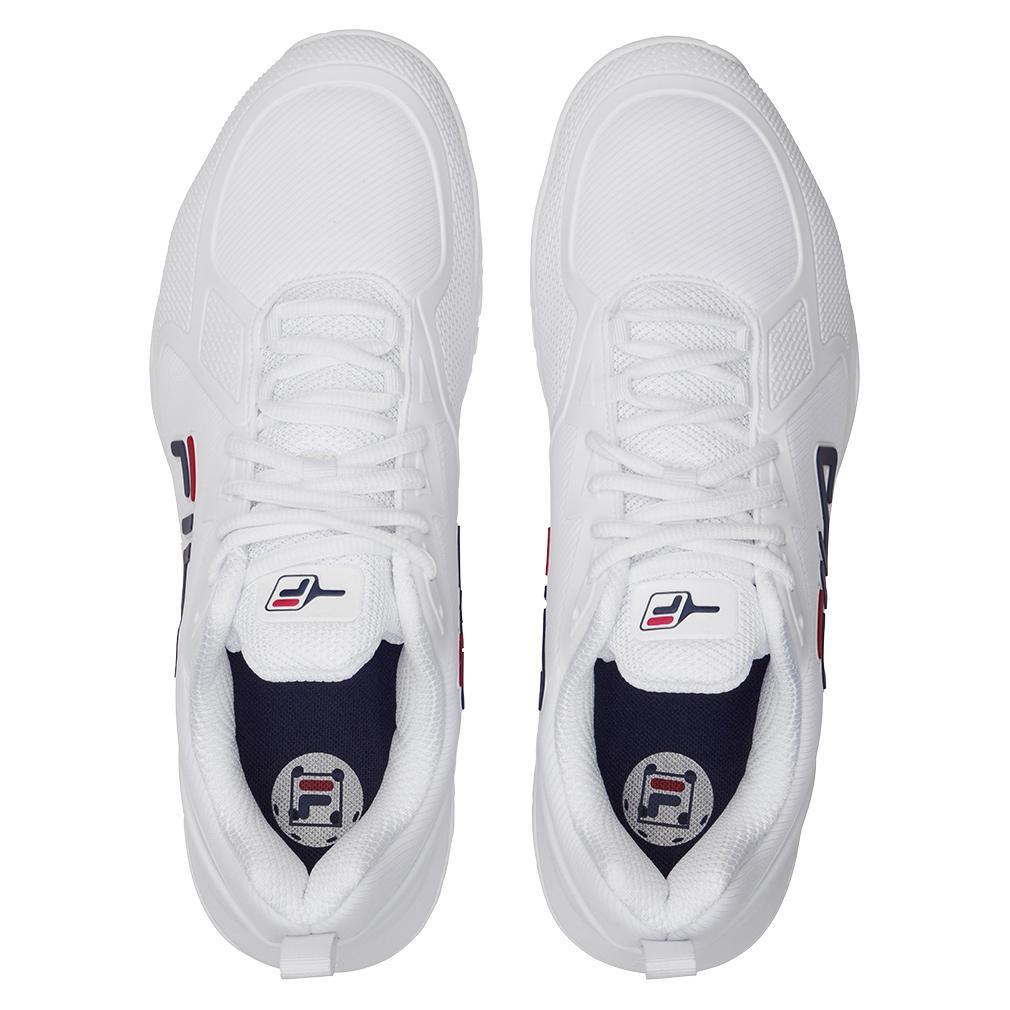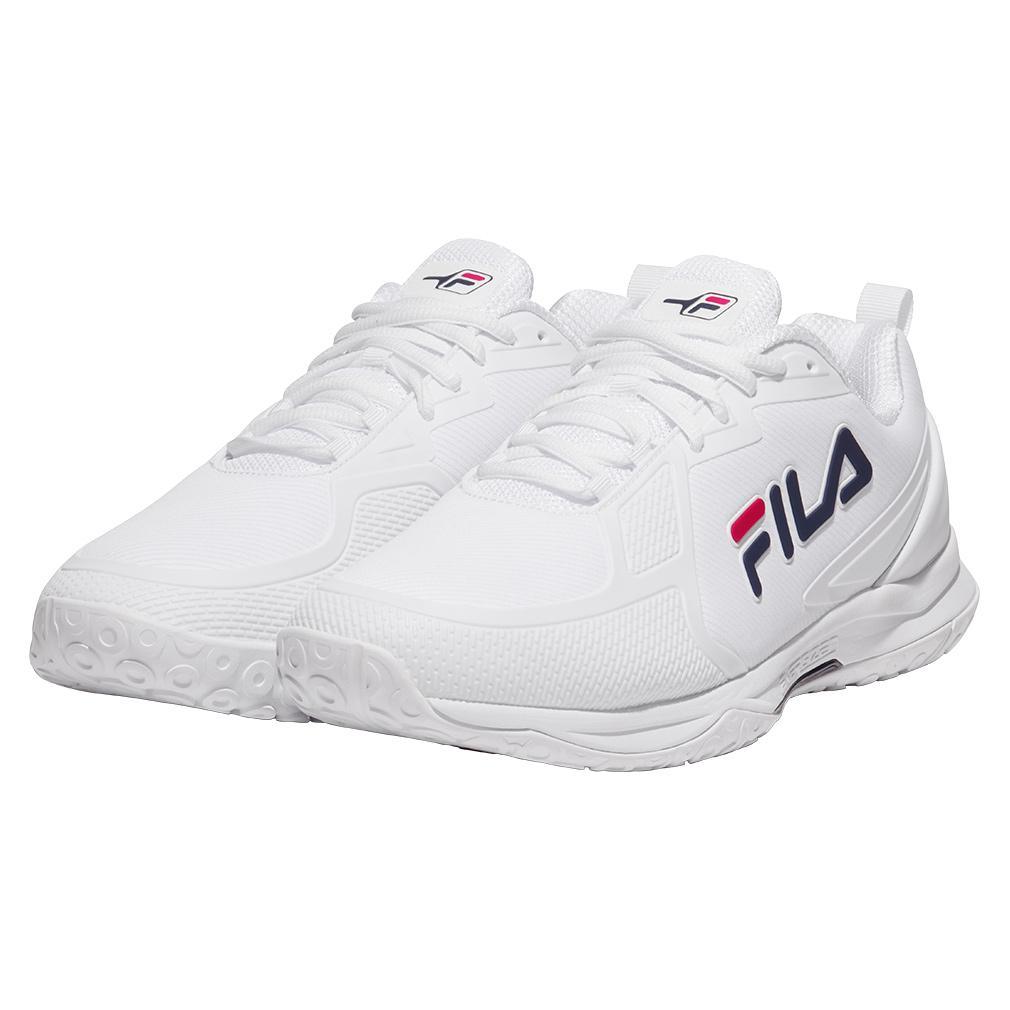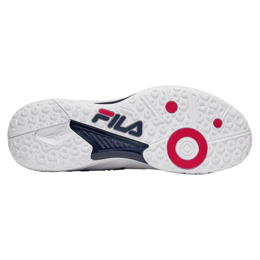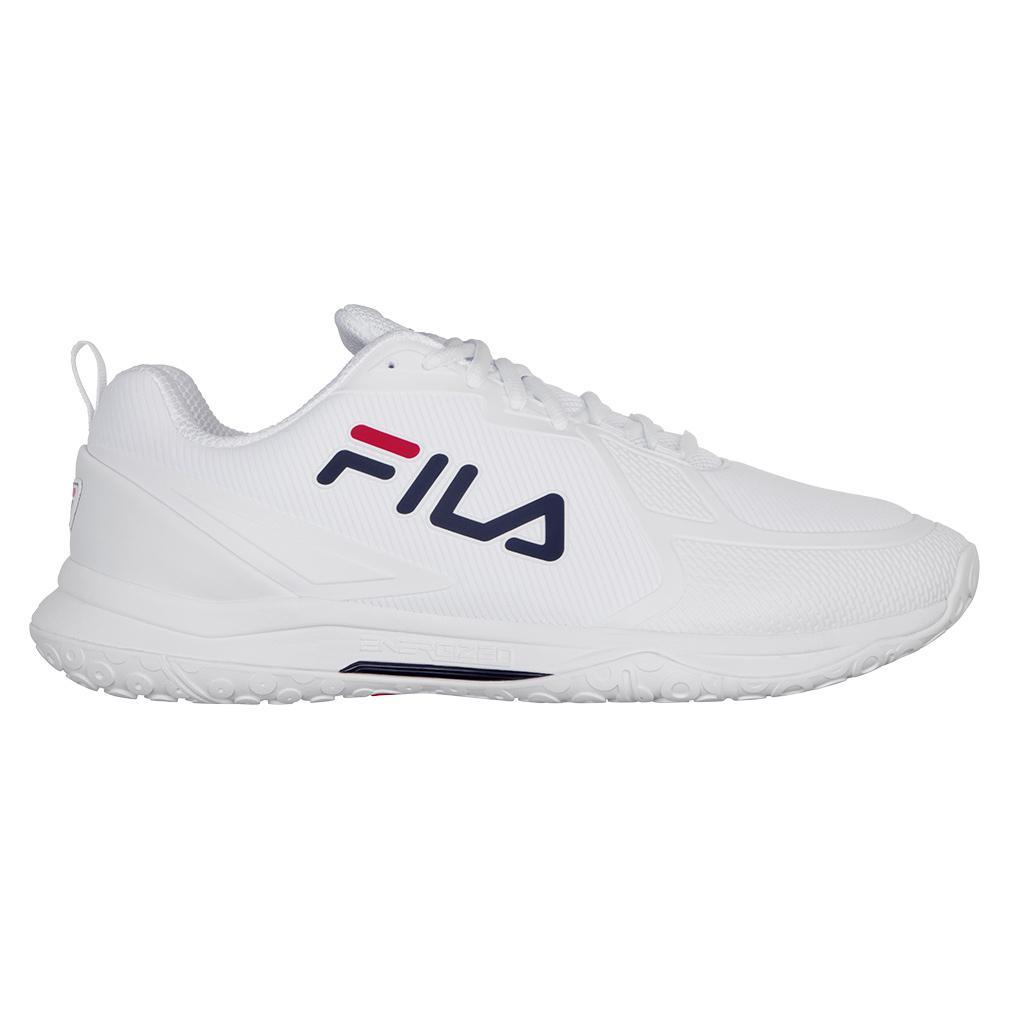Upper: Conventional lace-up construction for a secured fit. Lightweight woven upper with breathable mesh tongue and a durable KPU abrasion guard protects the high-wear forefoot areas. Branding includes Classic "FILA" as well as new FILA Pickleball logos.