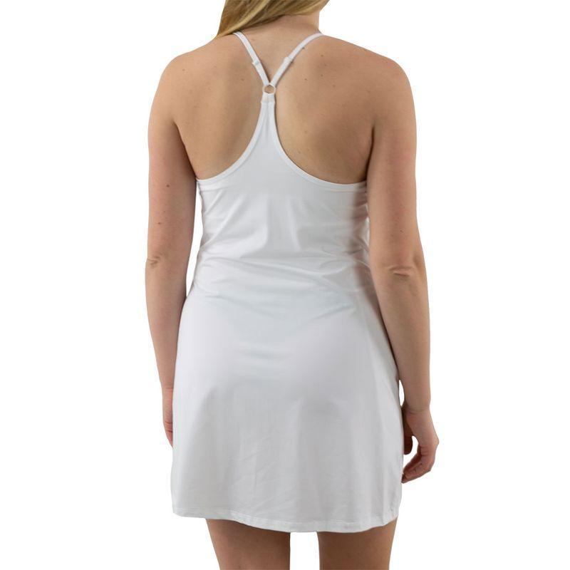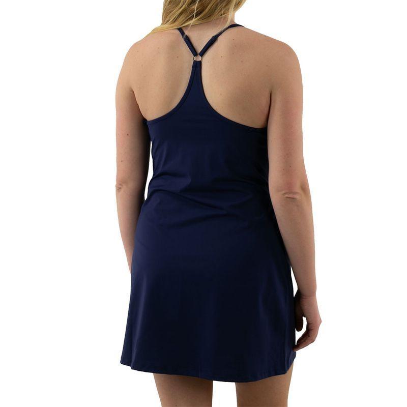 Go for the win in the Fila Women's Essentials Tennis Dress. Its thin shoulder straps converge into an O-ring at the back and are adjustable to fit your specific needs. The inside self-fabric bra with removable cups alongside the inner Forza ball shorts provides additional support and coverage. Flexible, moisture-wicking fabrics have 4-way stretch for comfort and performance. UPF 50+ sun protection keeps your skin healthy by blocking out up to 98% of the most harmful UV rays.