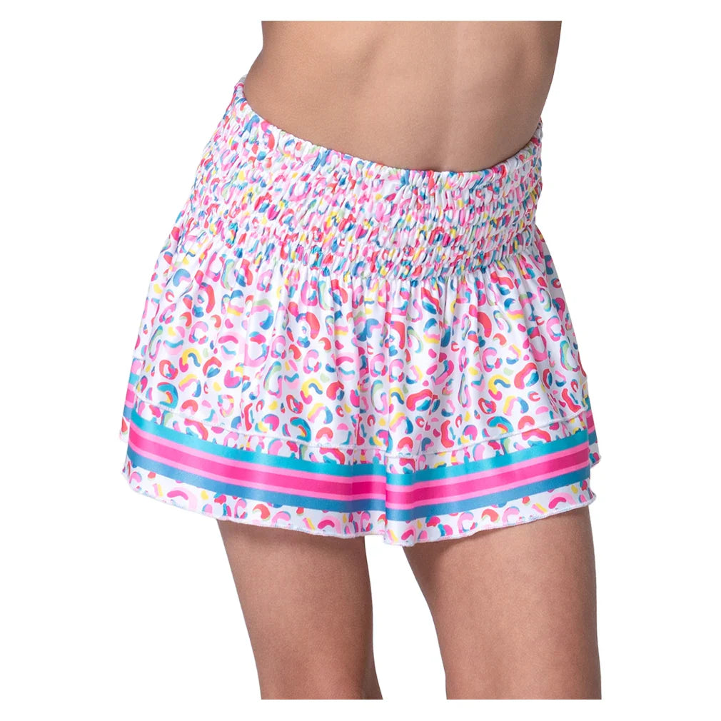 Add a fun and sporty touch to her game with the Lucky In Love Girls' Cheetah Drip Smocked Tennis Skort. Featuring playful two-tiered ruffles, this skort combines style with performance. The comfortable smocked elastic waistband ensures a secure fit, while built-in undershorts provide the support and coverage she needs for full freedom of movement on the court. Perfect for young athletes looking to shine with both flair and function.