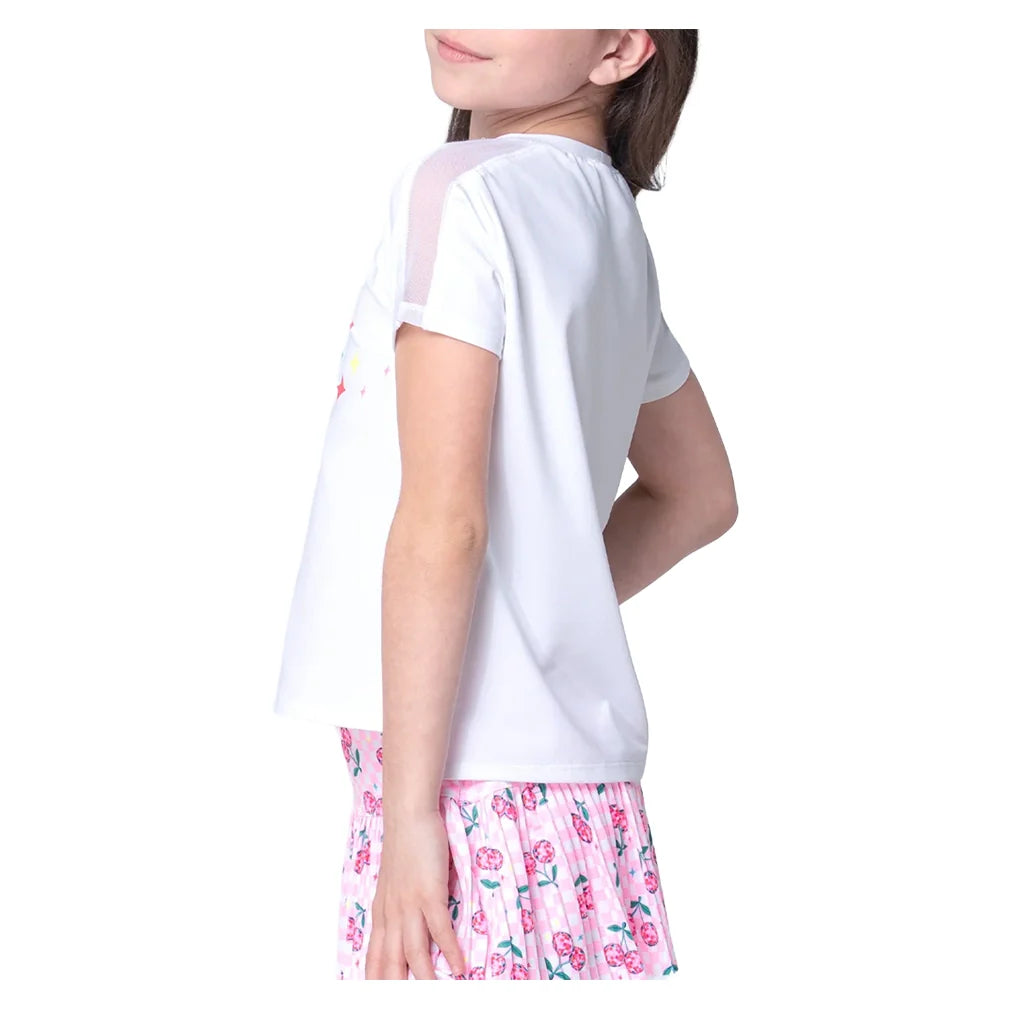 The Lucky in Love Girls' Disco Cherry Short Sleeve Tennis Top brings fun style to the court. This top features a classic crew neckline with short sleeves for comfortable coverage. Mesh detailing on the shoulders increases airflow during active play. Sporty side slits provide mobility and add an athletic touch. The high-low hemline gives extra coverage in the back while maintaining a contemporary look. The relaxed fit allows young players to move freely through every serve and volley.