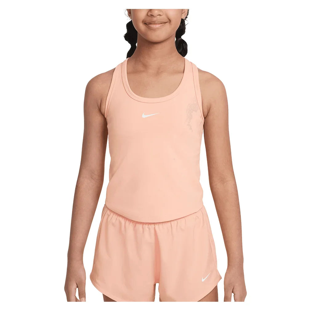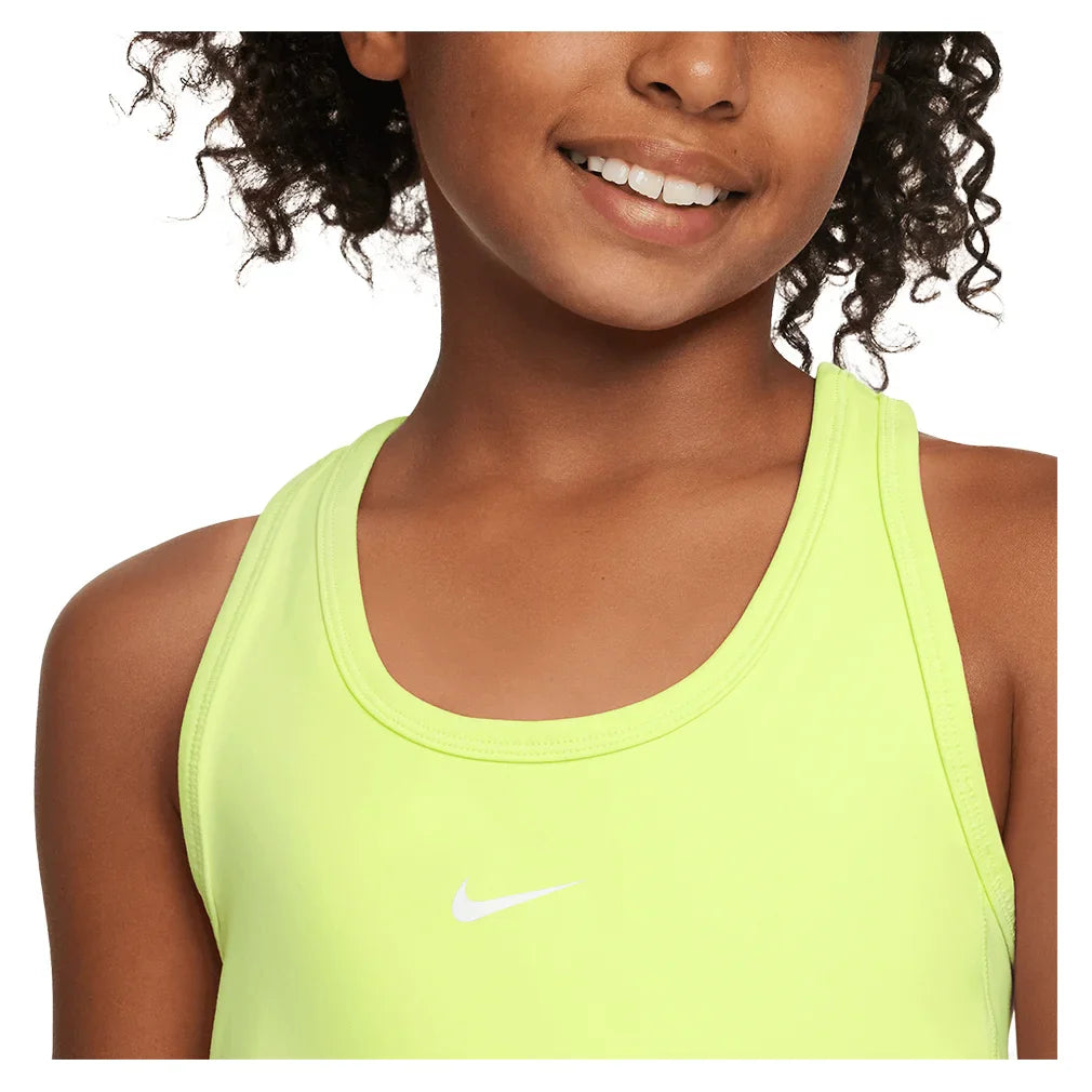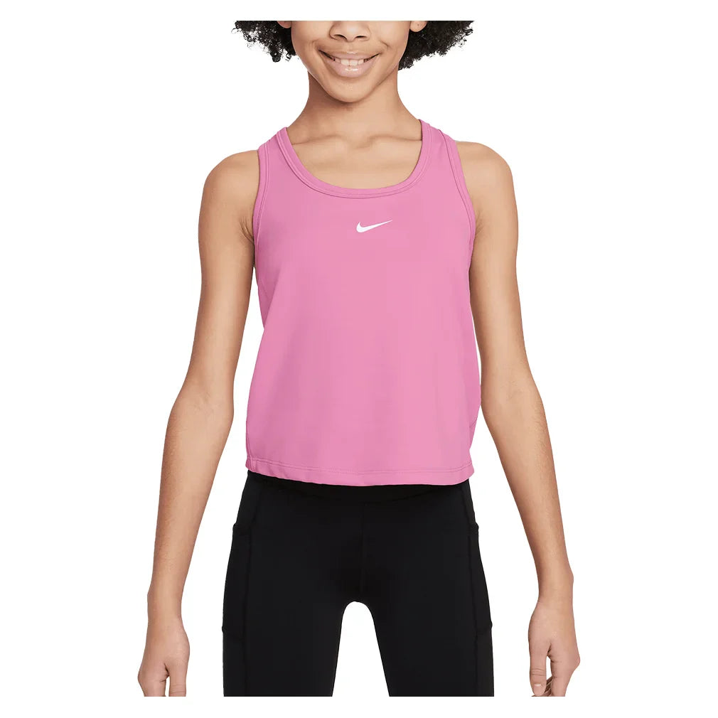 The NIKE Girls' Dri-FIT One Training Tank is perfect for whatever gets you moving. Play, practice and tennis match whatever it is, this tee keeps you dry and comfortable so you can do your best and have fun. It uses Nike's Dri-FIT technology to keep sweat away from your body so that you can focus on what matters most: having fun! The fabric is lightweight and breathable, so it feels like a classic t-shirt without feeling too loose or too slim. The ribbed collar stretches so you can easily pull the shirt on and off.