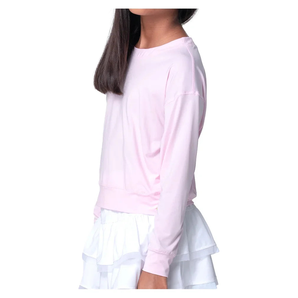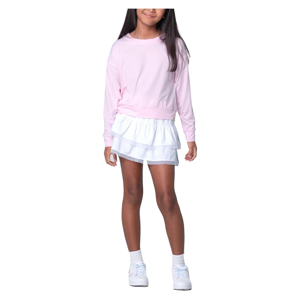 The Lucky in Love Girls' Hype Long Sleeve Tennis Top offers comfortable coverage with a relaxed fit that allows young players to move freely on court. A high neckline and full back provide appropriate coverage for active play, while long sleeves offer sun protection during outdoor matches. Ribbed cuffs and hemline create a secure fit that stays in place without restricting movement, maintaining a neat appearance throughout practice and play. The relaxed silhouette provides room for growth and layering, making this top a practical choice for year-round tennis. Perfect for junior players who need reliable coverage and comfort, this versatile piece combines thoughtful design with durable construction that stands up to the demands of regular court time.