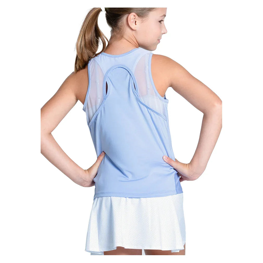 Let her shine on the court with the Lucky In Love Girls' Shimmer Tennis Tank. This sleeveless tank features a classic crew neck and breathable mesh straps, combining style with functionality. Designed for maximum comfort and freedom of movement, it's perfect for young athletes looking to perform their best while adding a touch of shimmer to their game-day look.