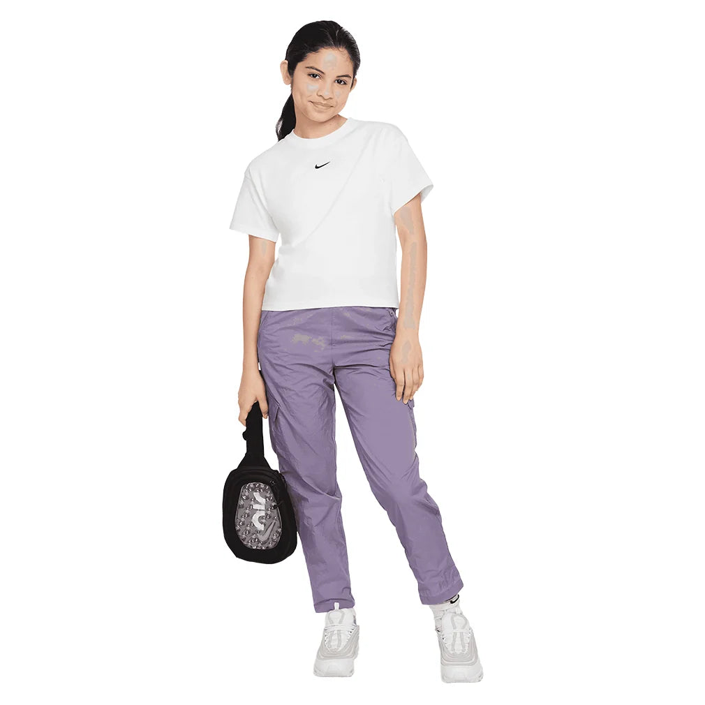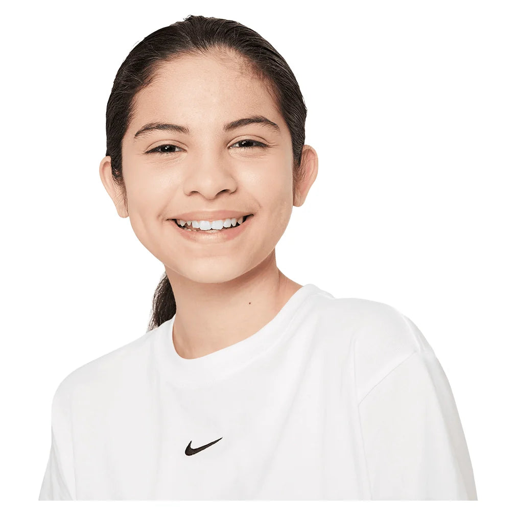 The Nike Girls' Sportswear Essential T-Shirt provides everyday comfort for young athletes. Made from soft cotton, this tee features a roomy fit that allows easy movement. Slightly dropped shoulders and extra space through the body create a relaxed silhouette that stays comfortable without excess length or bulk. An embroidered Swoosh logo adds classic Nike branding.