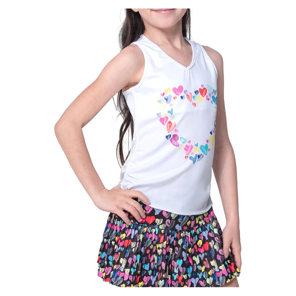 The Lucky in Love Girls' Thumbprint Hearts Tennis Tank delivers style and comfort for young players. This tank features a high V-neckline that provides coverage while keeping athletes cool. Ruched detailing along the sides creates a flattering silhouette and adds visual interest. The curved hemline offers extra coverage during active play while allowing a full range of motion. This versatile tank works equally well for practice sessions, match play, or casual wear.