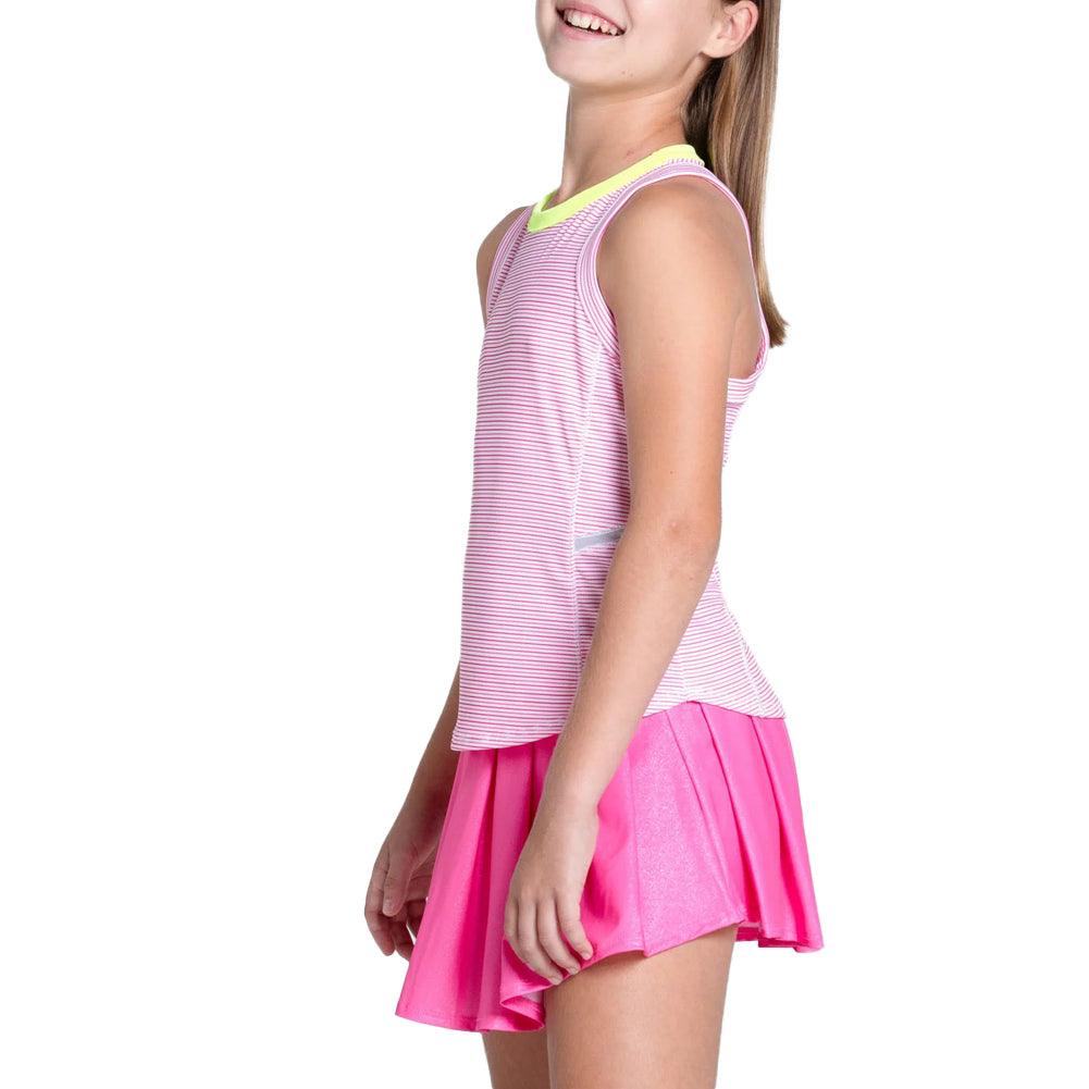 Get ready to soar with the Lucky In Love Girl's Victory Streak Tennis Tank. Crafted with breathable fabric, this tank top keeps your young athlete cool and comfortable during intense matches. The mesh detailing also adds a trendy touch while enhancing breathability, allowing for optimal airflow. With a slight racerback design, this tank top offers freedom of movement for her overhead swings. Complete with a rounded hemline, providing additional coverage that will give her confidence on the court.