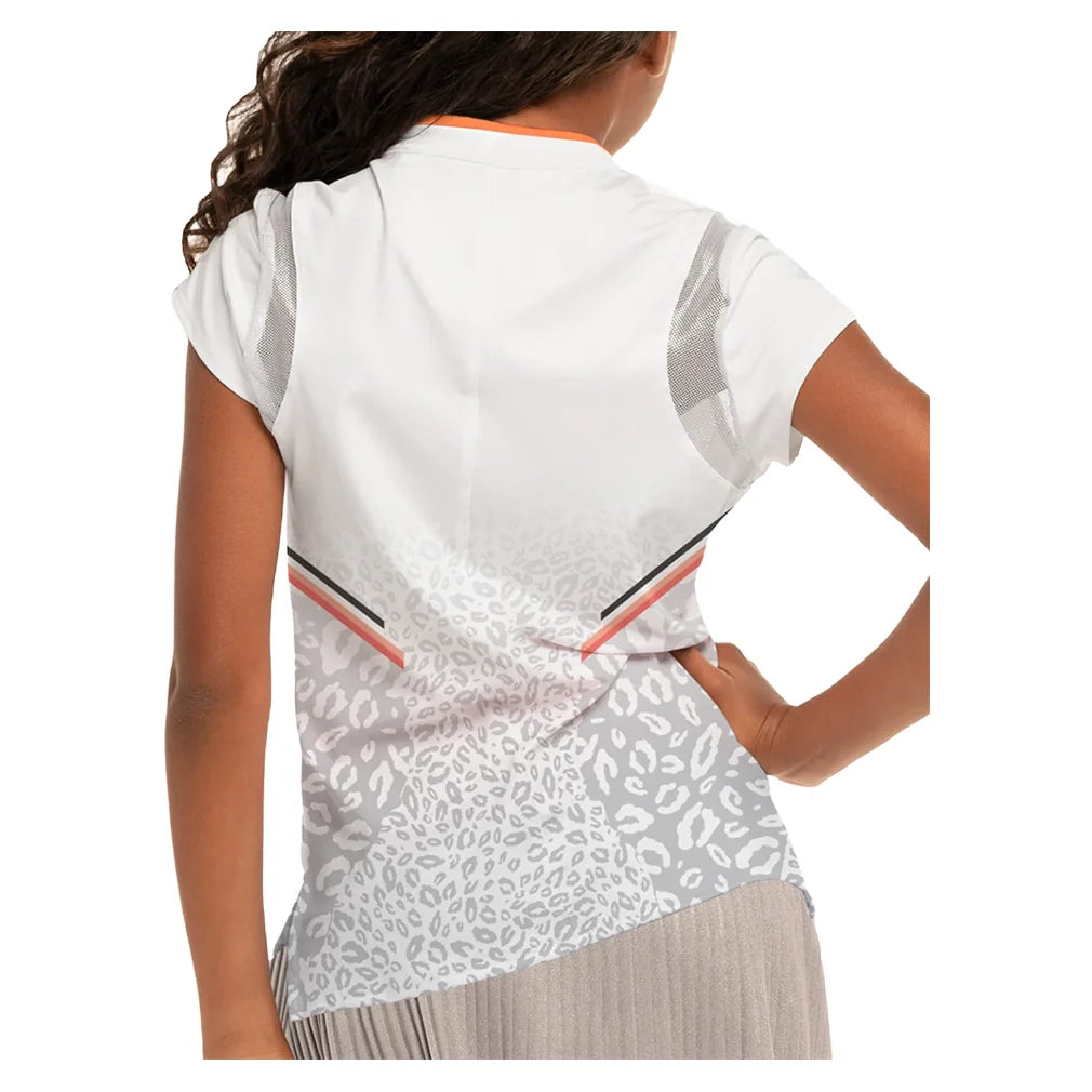 Have her take on the competition in our LUCKY IN LOVE Girls' Wild Cat Short Sleeve Tennis Top in White. This V-neck tennis top has a cute short sleeve with an orange-trimmed mandarin collar. It also has a longer hemline in the back for extra coverage while she plays. The top also has a charming gradient animal print making it easy to pair with her favorite bottoms, or the skorts from the Lucky In Love Animal Instinct Collection.