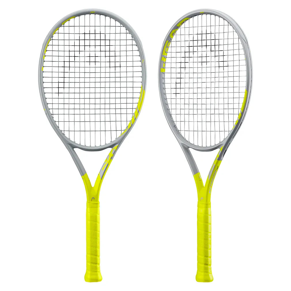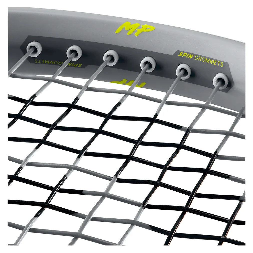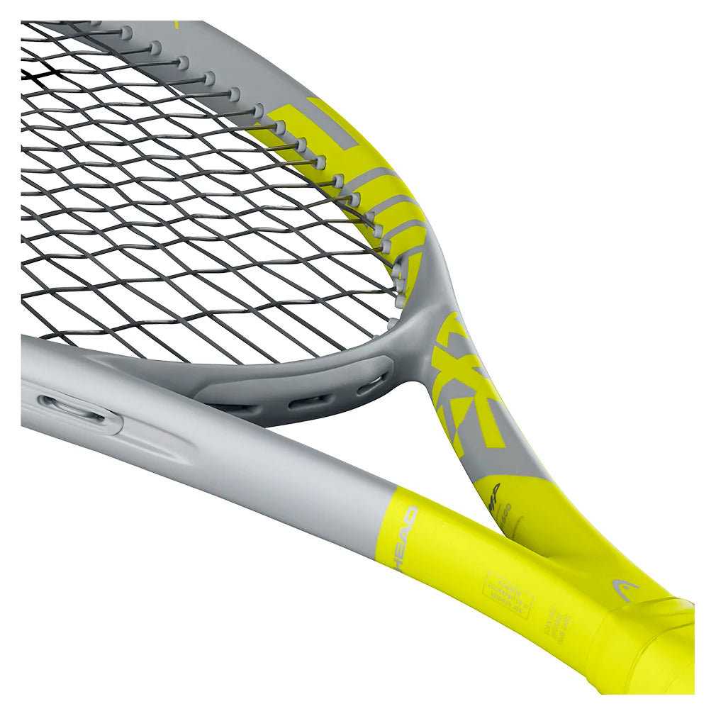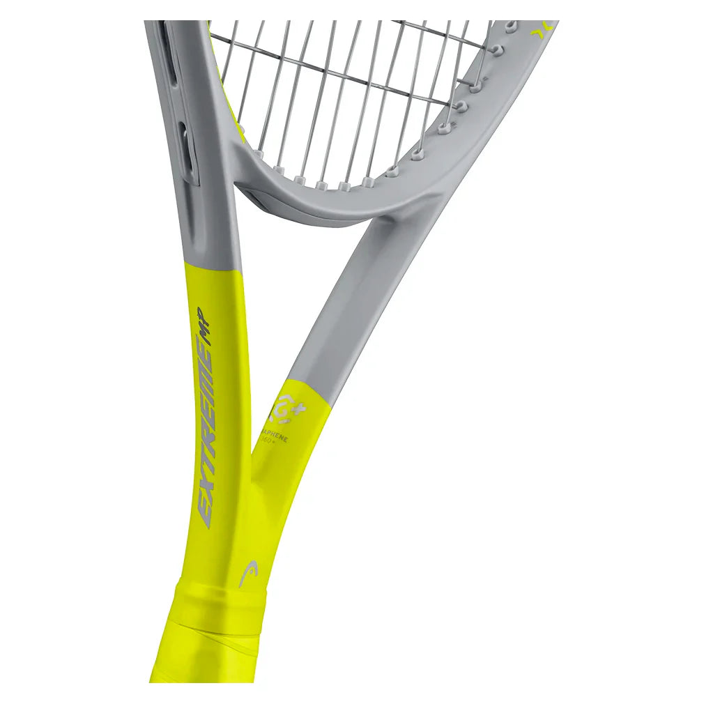 HEAD updates its most spin-friendly racquet franchise with the Graphene 360+ Extreme MP Tennis Racquet. The new Extreme MP incorporates an eye-catching, new design identity with a light grey hoop and traditional Extreme yellow on the shaft. Enlarged Spin Grommets appear at the 12 o'clock position of the head, which enlarge the sweet spot and encourage more string movement for increases in spin and power. Continuing the trend from HEAD's recent refreshes, the Extreme MP blends Graphene in the head and shaft for better stability and increased energy return, with innovative Spiralfibers in the lower hoop for a more comfortable flex at contact. Additionally, the unique elliptical cross-section encourages more torsional flexibility for an extremely comfortable hitting experience. The 23/26/21 millimeter cross section provides impressive stability and power, even when hitting outside the traditional sweet spot. The Extreme MP plays much more comfortably than most racquets in the "tweener" category, and it is a perfect solution for heavy top spinners because it's easy to swing. Thanks to the manageable swing weight and unstrung weight of 10.6 ounces, the Extreme MP adds impressive mobility to the powerful 100 square inch head.