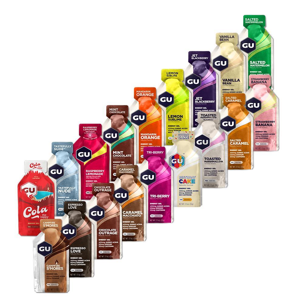 Kick up your sports nutrition with GU Energy Labs Energy Gel packs, available in a wide variety of flavors to satisfy every player. Created for daily training and competitions, these energy-dense 100 calorie packets help sustain the high energy demands of any duration or activity. Just rip open the top and squeeze the entire packet into your mouth! Consuming one packet every 30-45 minutes of exercise will help maintain energy and keep you playing at your best. The Strawberry Banana, Peanut Butter, and Root Beer flavors are Caffeine Free, so they’re safe for kids, too! Maltodextrin and fructose are the carbohydrates that use non-competing pathways to help maximize carbohydrate absorption and utilization while diminishing stomach stress. Sodium, the primary electrolyte lost in sweat, aids in hydration by maintaining water balance. The branched-chain amino acids – leucine, valine, isoleucine – may reduce mental fatigue and decrease muscle damage, so these Energy Gels are also recommended in post-workout recovery.