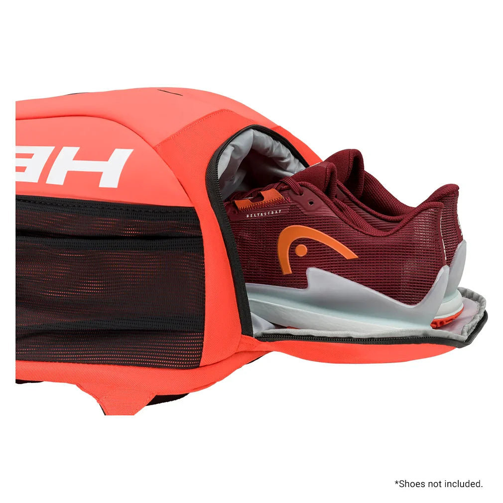 Stay ahead of the game with the HEAD Tour Tennis Backpack. It can hold up to 2 tennis racquets, ensuring you have a spare ready to go in the middle of a match. The main compartment can store your essential tennis gear, plus an outer zipper pocket gives extra space to stash smaller items. 2 outer accessory pockets provide the perfect space to store your water bottles and tennis ball cans. An integrated shoe pocket lets you store your tennis shoes and keep them separate from the rest of your valuable tennis gear.