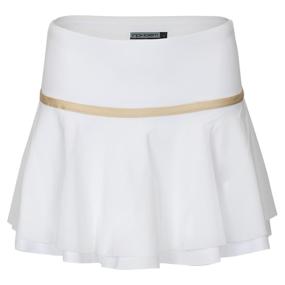 Find your peak performance with the Inphorm Women's Harlow 13.5 Inch Skort. This skort is comfortable, stylish, and designed to enhance your tennis mobility. Its built-in shortie offers enhanced convenience and allows wearers to hold up to two tennis balls at a time. The flounce at the bottom offers both added style and mobility, and its moisture-wicking technology helps sweat dry quicker. UPF 30+ fabric will protect your skin from harmful UV rays. A horizontal sand-colored line wraps all the way around this skirt, adding a pop of color to an otherwise all-white garment.