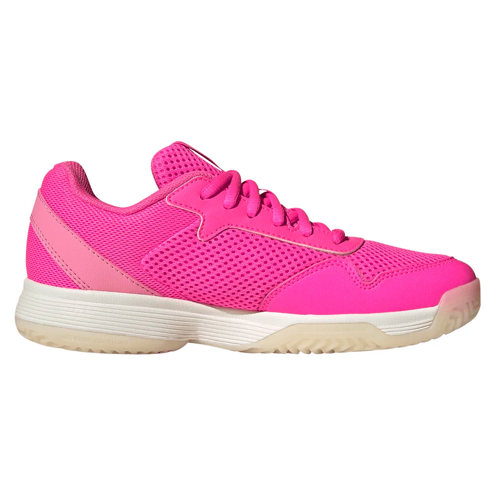 The adidas Junior's CourtFlash Tennis Shoes are designed for the casual recreational player who wants a lighter-weight option. The woven mesh upper provides a lightweight yet secure feel, and a textured heel counter helps keep the heel locked in during play. The shoe's EVA midsole offers solid cushioning while still feeling connected to the court surface. Adidas' ADIWEAR rubber outsole helps protect the shoe against abrasive hard court surfaces. The CourtFlash represents a nice value shoe focused on speed and mobility. adidas used its PRIMEGREEN recycled material in the construction of the CourtFlash.