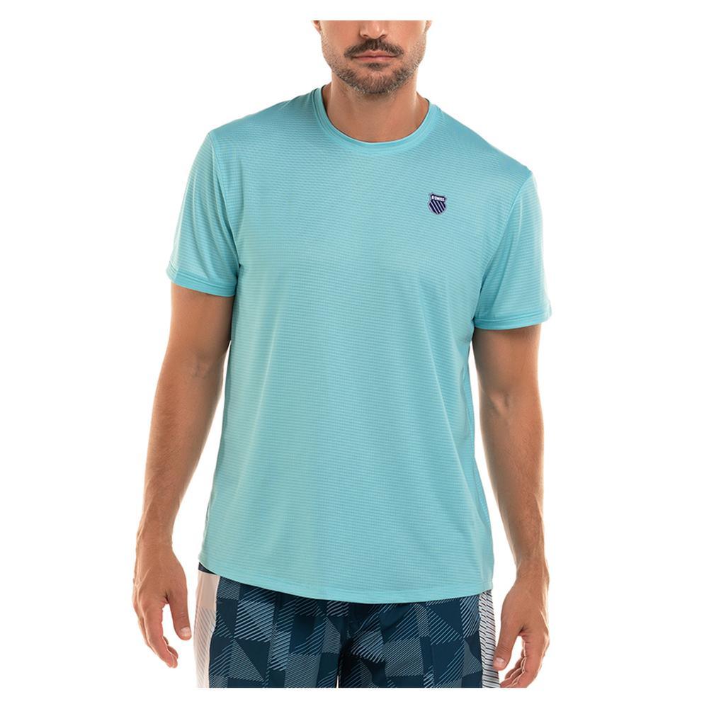 Become a superstar with the K-Swiss Men's Grid Short Sleeve Tennis Top. This crew neck shirt features a simple design, using a ripstop texture topped off with the signature shield chest logo. Performance jersey fabrics deliver maximum breathability alongside ease of movement. Moisture-wicking technology helps athletes stay cool and confident to score match-winning points.