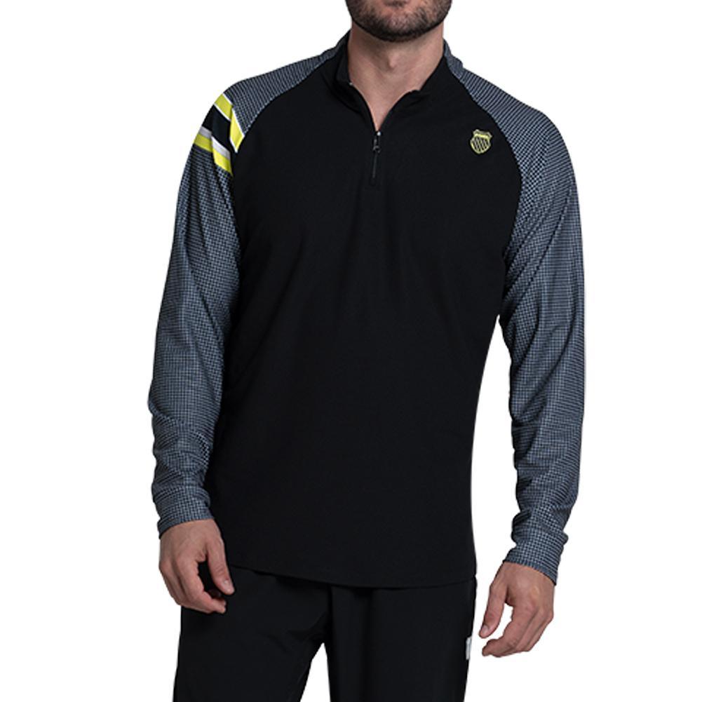 Get ready for your match with the K-Swiss Men's Striker 1/4 Zip Long Sleeve Tennis Top. Done in a mid-weight performance fabric, you can get warm without overheating. This performance long-sleeve features a zip mock neck and rugby shoulder stripe detail that adds to this sporty look and a touch of color. The K-Swiss logo is on the left chest.