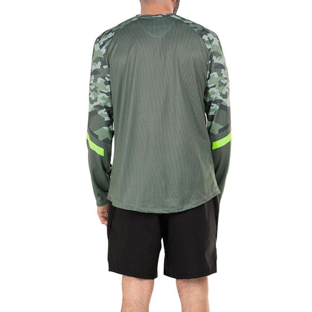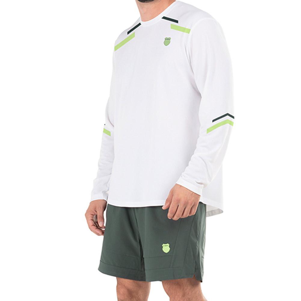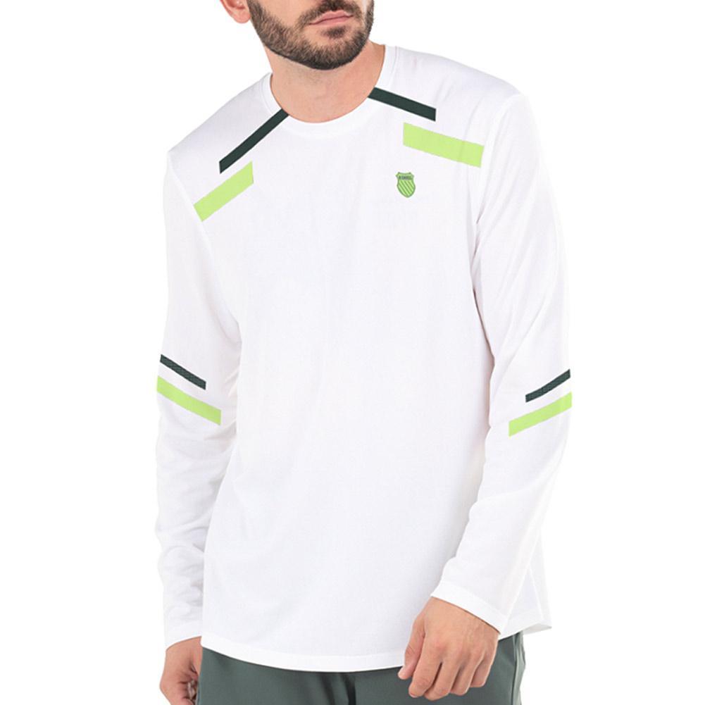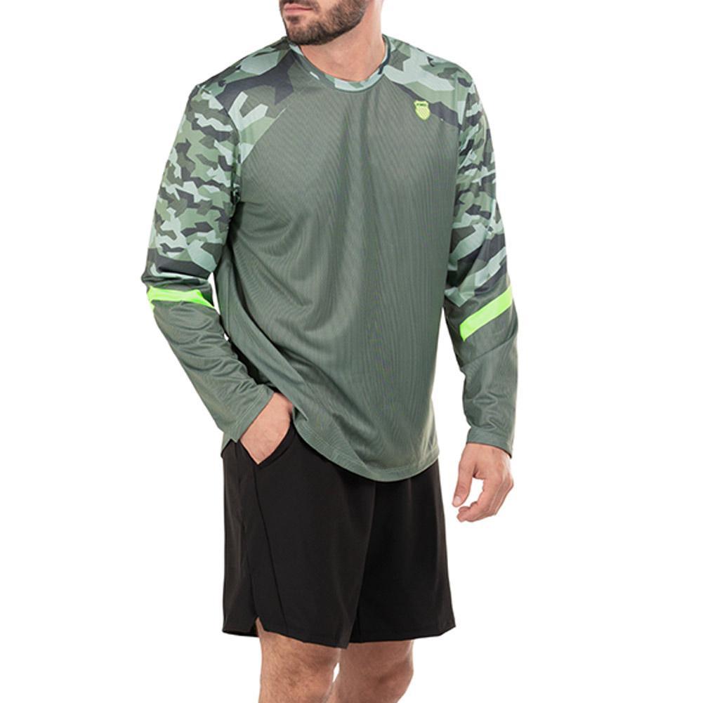 The K-Swiss Men's Urban Camo Long Sleeve Tennis Top combines form, function, and style into one stellar package. Its neon sleeve highlights are complemented by the vibrant K-Swiss patch logo to create a striking design. High-gauge ventilated mesh jersey allows superior breathability for cooling, while moisture-wicking properties keep sweat off your skin for fast-drying relief.