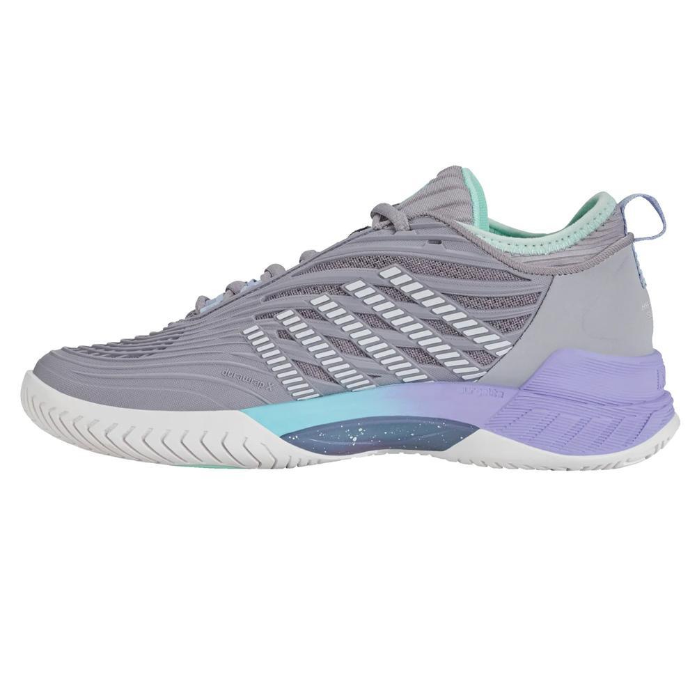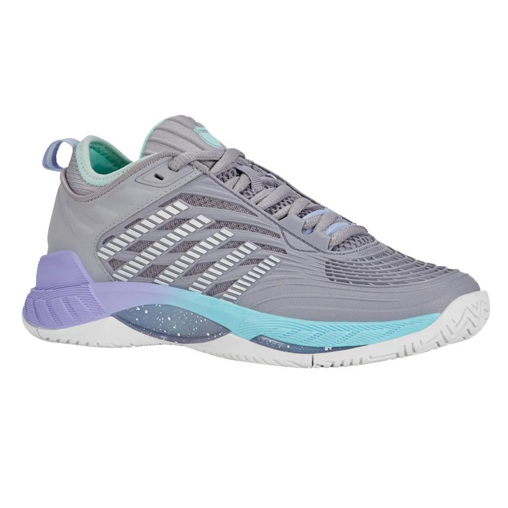 The K-Swiss Women's Hypercourt Supreme 2 Tennis Shoe is an update to one of K-Swiss's most popular tennis shoes. Key features are a more secure fit, increased support, and more outstanding durability while maintaining maximum comfort. The Durawrap X upper provides support and drag protection while keeping a flexible feel as you track down the next ball. The Dual-density midsole utilizes the lightweight Surgelite external foam for maximum comfort and support. A high rebound Shock Spring inner foam on the forefoot allows a quicker reaction in every step. The Dragguard 7.0 rubber outsole is formed into a modified herringbone tread pattern for traction and durability on all court surfaces. The newly engineered soft bootie collar gives a more secure fit around the ankle.
