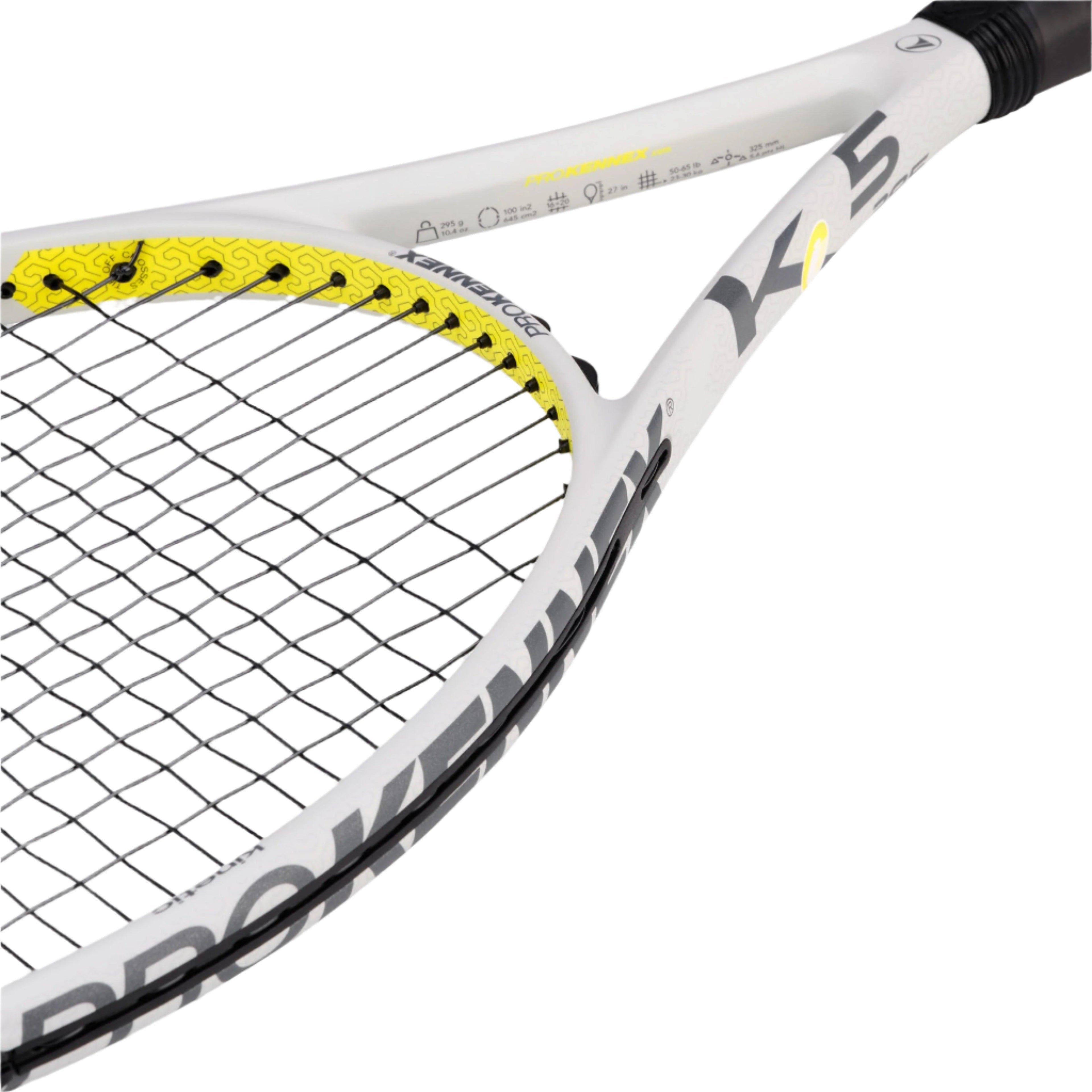 The ProKennex Ki 5 (295) 2023 Tennis Racquet gets new frame shape and throat redesign for 2023! The changes add improved stability and added flex. To keep the Ki 5 one of the most comfortable and arm-friendly models out there, ProKennex incorporates Kinetic Mass microspheres contained within capsules, which are inside the frame and move at contact with the ball. The technology helps maximize power with reduced muscle fatigue and it works in tandem with the Comfort Cap in the racquet handle to further attenuate vibrations. The Ki 5 features a spacious 100 square inch head, 16x20 string pattern, and a control oriented 22 millimeter cross section. This model from ProKennex will work well for intermediate and advanced aggressive players with fast and long swings.