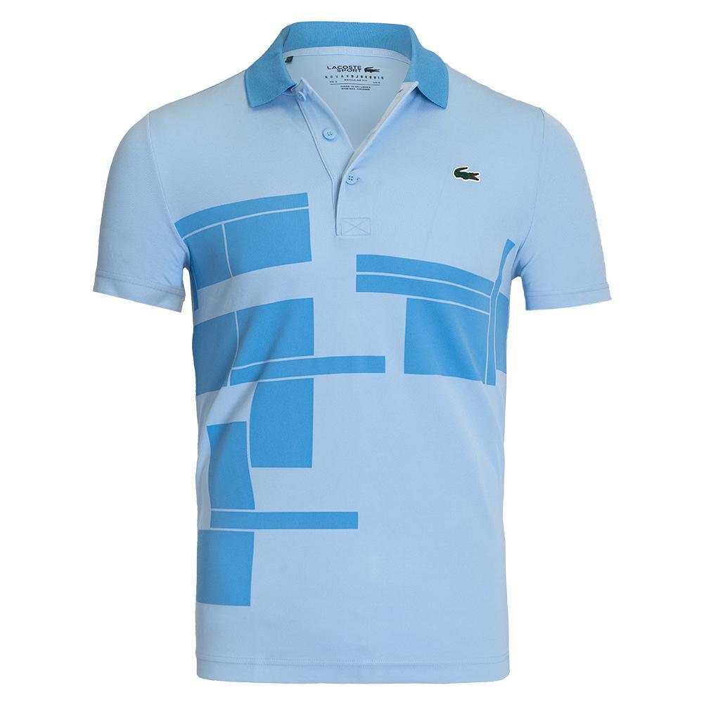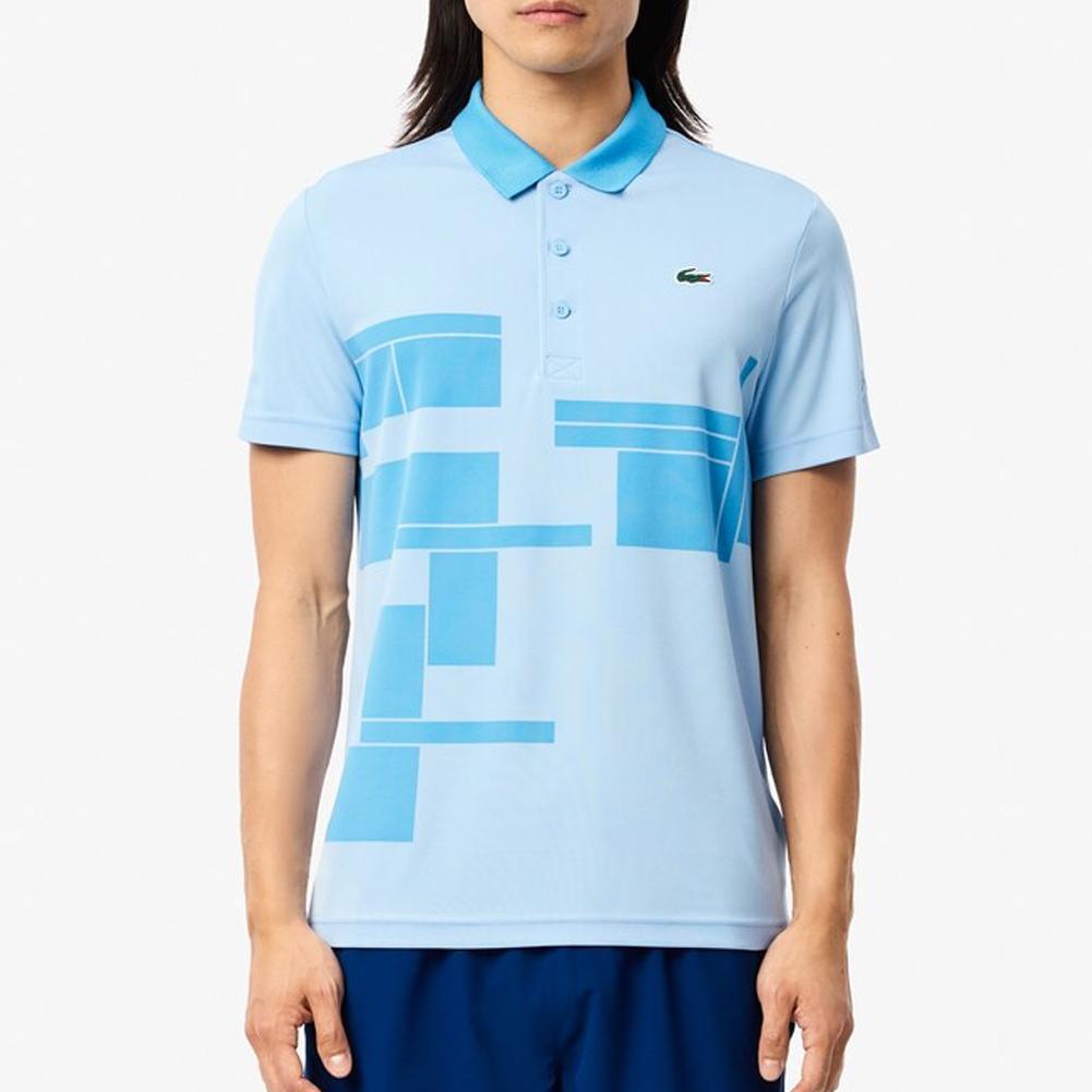 Play like Djokovic when you wear the Lacoste Men's Novak Djokovic Graphic Tennis Polo (Fan). This tennis polo is designed for maximum comfort and enhanced performance. Its classic collar, which is a slightly darker shade of blue, is paired with a two-button placket for style and convenience. The front of the shirt features rectangular shapes that give the polo a weird yet interesting look. The iconic Lacoste alligator can be seen embroidered over the left chest.