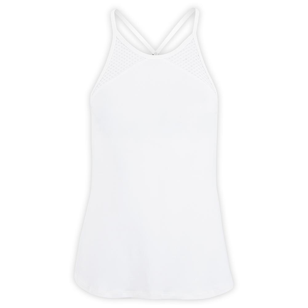 Bring some style to the courts with our Lija Women's Loop Tennis Tank. This tank has a flattering high neckline with slim straps. There are also tonal mesh panels on the upper chest and the tank offers a skimming fit. Fully equipped with moisture-wicking, quick-drying, and four-way stretch. Get ready for your next game with this sporty tank.