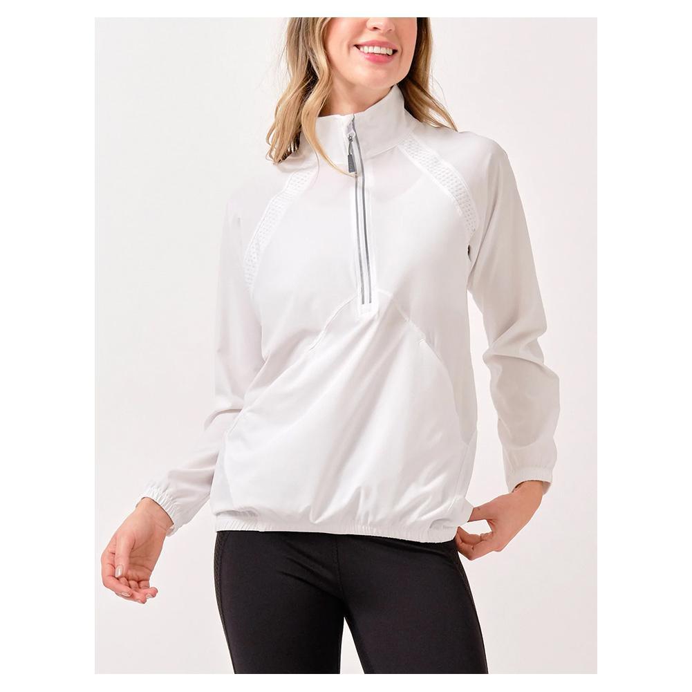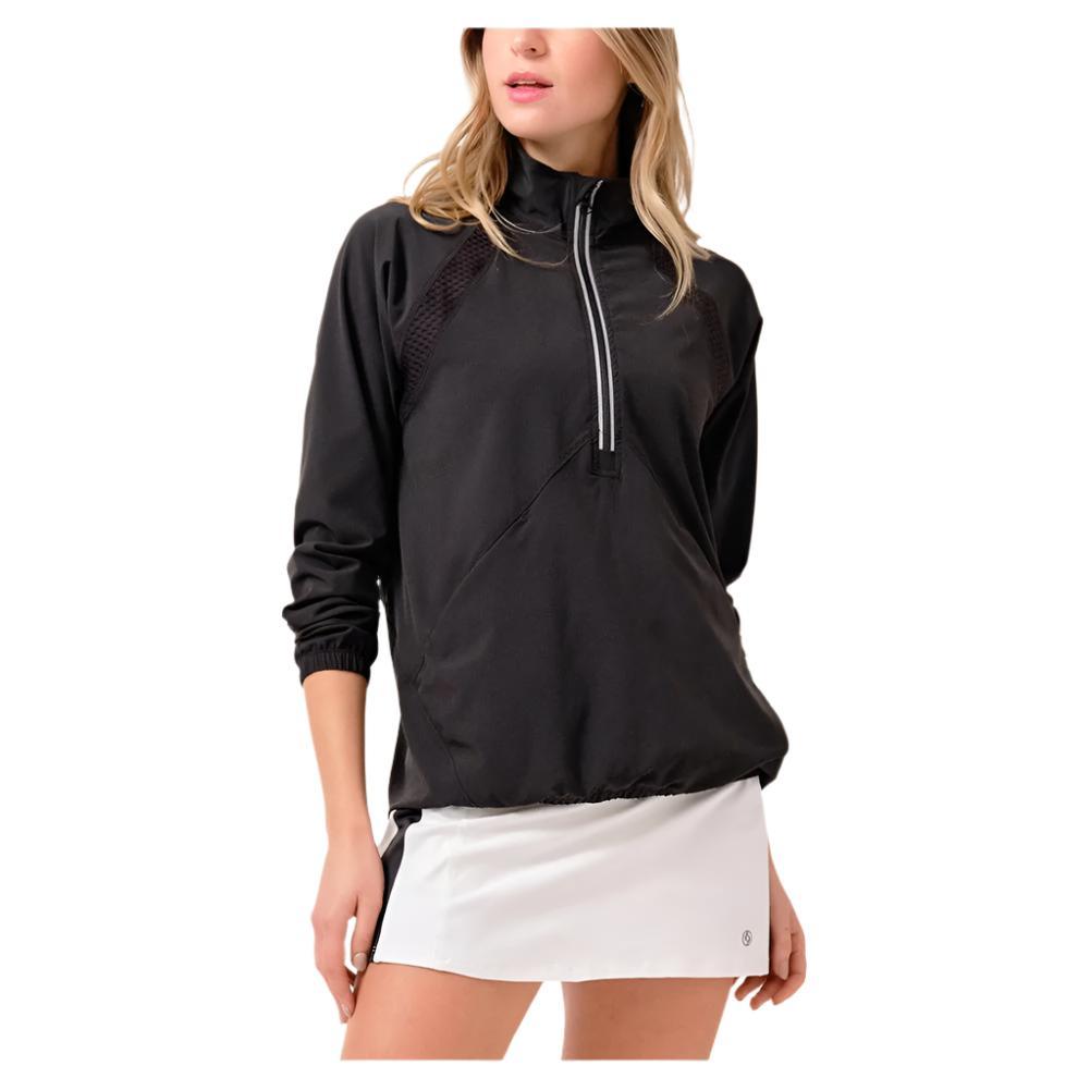 Make a stylish appearance at the courts in this Lija Women's Nevo Etoile Tennis Jacket. This tennis jacket has a fitted waist and cuffed sleeves. It also has a long zipper that you can utilize for ventilation and wide pockets perfect for holding a ball or two. Use this jacket for warming up or cooling down. Be sure to pair it with other apparel by Lija and feel inspired to play in style.