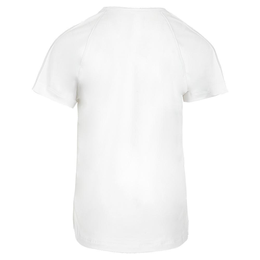 Update her tennis whites with the Little Miss Tennis Girls' Notched Collar Tennis Top in White. With its sporty raglan sleeves, snug fit, notched collar and curved hem, this top is set to become her favorite on the training courts and match days alike. Pair with the Little Miss Tennis Girls' Peek A Boo Pleat Tennis Skort in White for a complete outfit!