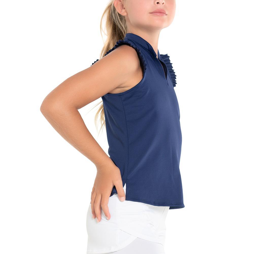 Your little girl will love our LUCKY IN LOVE Girls' Pleat Me Up Tennis Tank in Navy. This tennis tank has a stylish mandarin collar with pleated sleeves that flare out to the sides of the tank. It also comes with a full back and a longer hemline in the back for extra coverage. Pair this tennis tank with the colorful skorts from the Lucky In Love Collection.