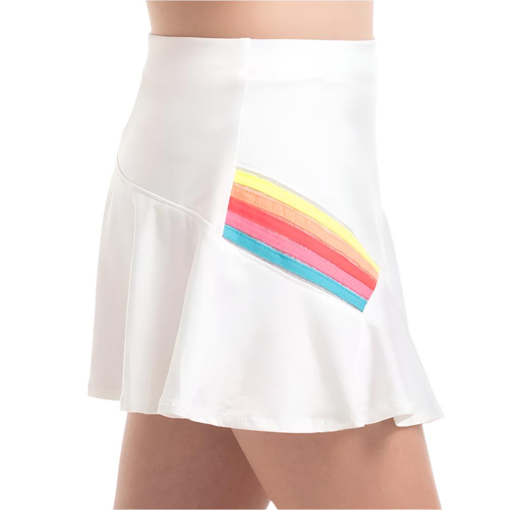 Let her showcase her style with our Lucky In Love Girl's Prisma Stripe Tennis Skort, a modern take on the classic sports skirt. Designed with an easy flounce shape, it allows for freedom of movement while she plays. The mesh insert features a multicolor retro stripe border, adding a vibrant pop of color and enhancing breathability. Redefine her on-court look with the Lucky In Love Girl's Prisma Stripe Tennis Skort and elevate her game with style and comfort.