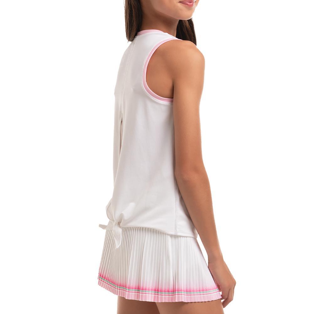 The Lucky In Love Girl's Retro Deco Tie Back Tennis Tank offers a blend of style and functionality for young tennis players. Featuring a tie-back design and slight racerback, this tank provides a trendy look while allowing for freedom of movement on the court. The breathable fabric and mesh paneling on the front ensure optimal ventilation to keep players cool and comfortable during intense matches. With its high neckline, this tank offers classic coverage and a stylish silhouette. Whether practicing drills or competing in matches, this tank is a versatile and practical choice for young athletes looking to elevate their game with flair.