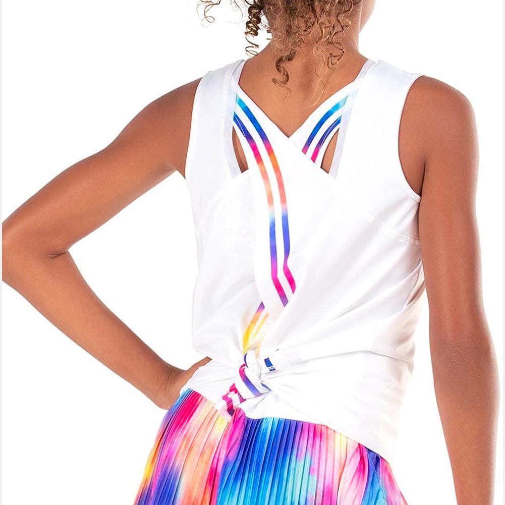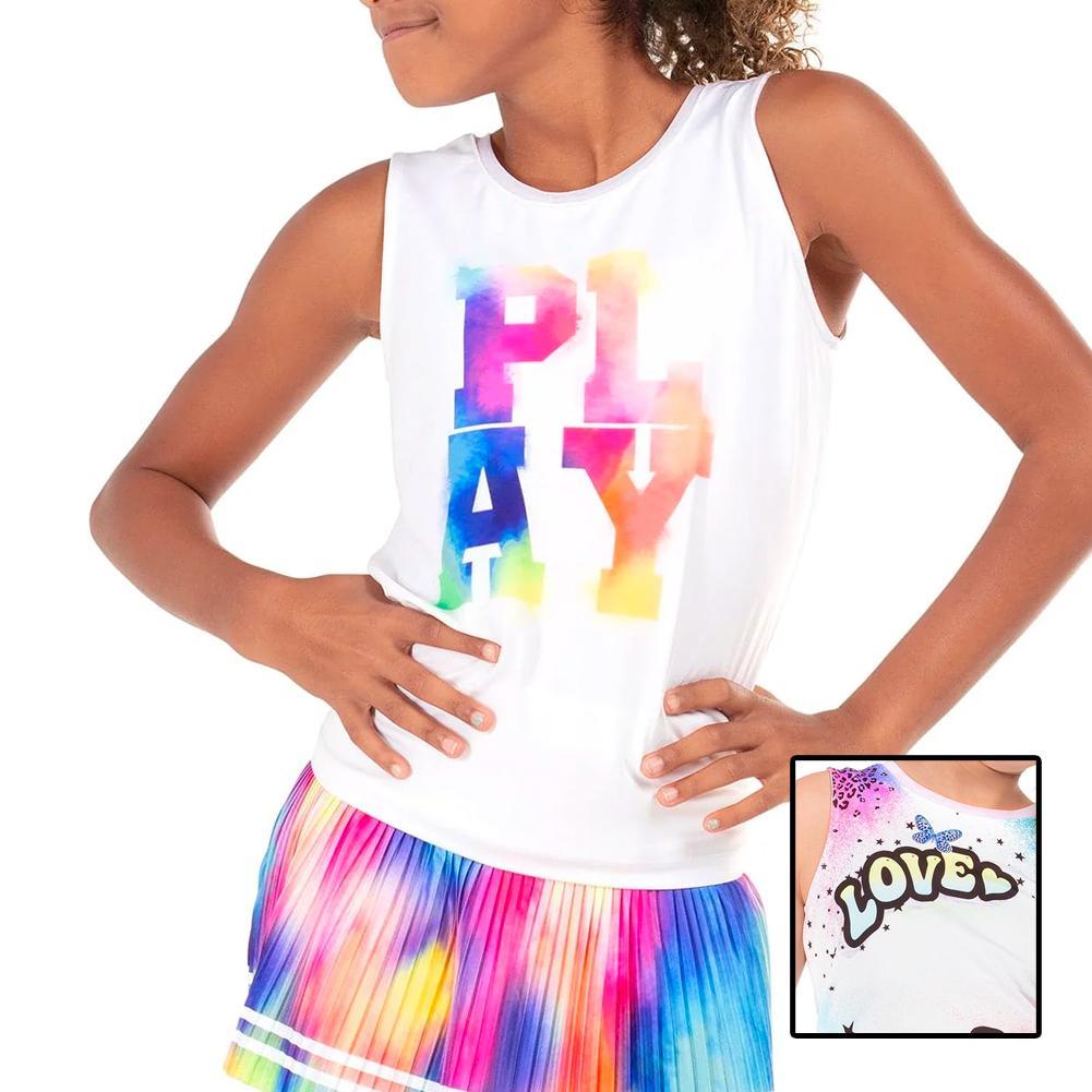 The fun never stops with the Lucky in Love Girls' Tie Back Tennis Tank. This crew neck top brings joy and brightens the mood wherever it goes. The back side can be tied to fit her needs, whether to create a slimmer fit for a sleeker style or loosen up for the big game. Be sure to pair it with the Luck in Love Girl's All Smiles Tennis Skirt for the complete look.