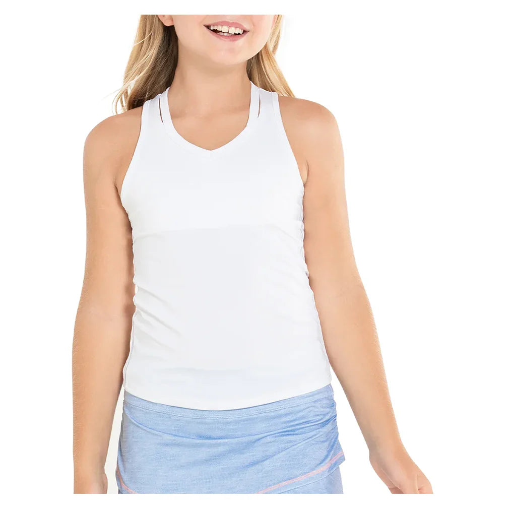 Amp up her style in the Lucky In Love Girls' V-Neck Cutout Tennis Tank in Pink. The cutout details at the neck elevate the classic tank to give her a trendy and modern look. She'll enjoy a free range of motion to perfect each shot with the sleeveless construction and stay dry every step of the way with moisture-wicking properties. Pair this with the Lucky In Love Girls' Match Point Tennis Short for a statement-making full look!