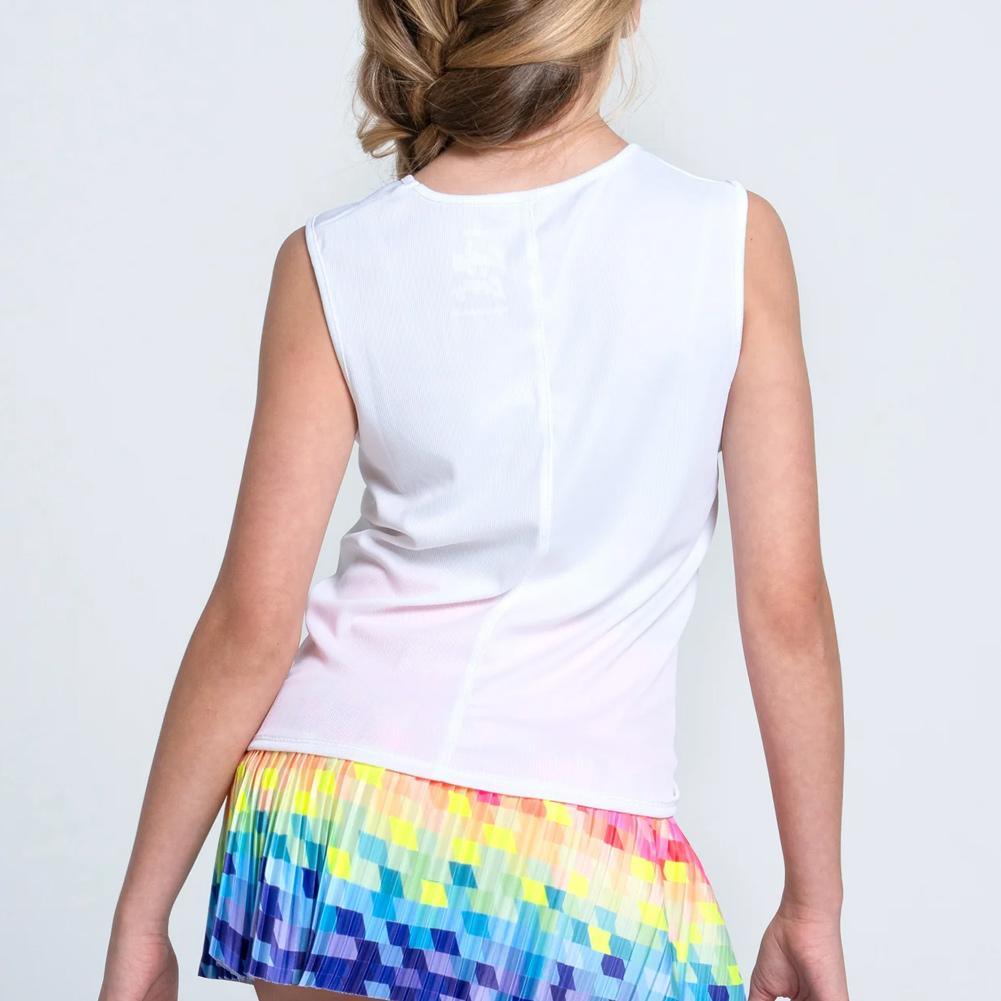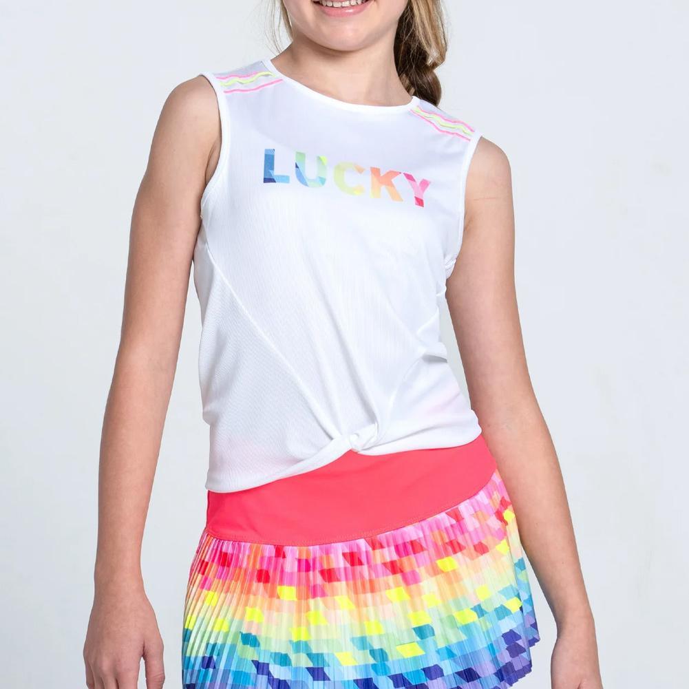 Bring smiles to the court with the Lucky In Love Girls'Love In Color Tennis Tank. Its rainbow-printed front graphic is complemented by stripes at the shoulders for a simple yet fun look. The front side can be tied at the hem for a more playful style. Pair it with the Love In Color Skirt for a complete look.