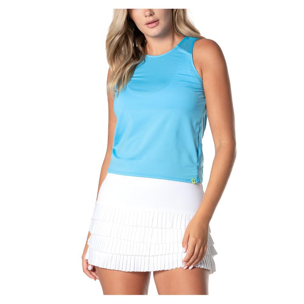 Feel the LUV with the Lucky in Love Women's Freedom Crop Tennis Tank. UV blocking is the name of the game, with UPF 50+ sun protection keeping harmful sun rays from damaging your skin to promote a healthier lifestyle. The tie-back tank allows you to adjust the fit on the fly for a flattering style wherever you go. Mesh paneling on the shoulders further heightens the cooling effect, providing ventilation for greater breathability.