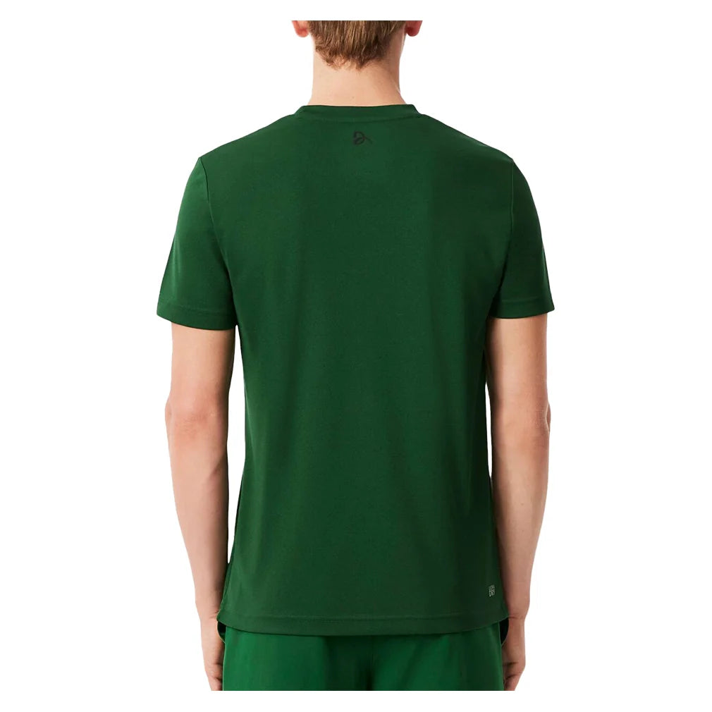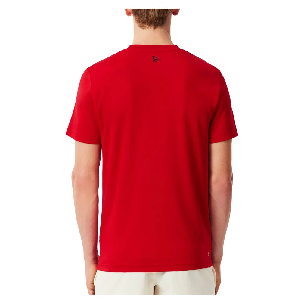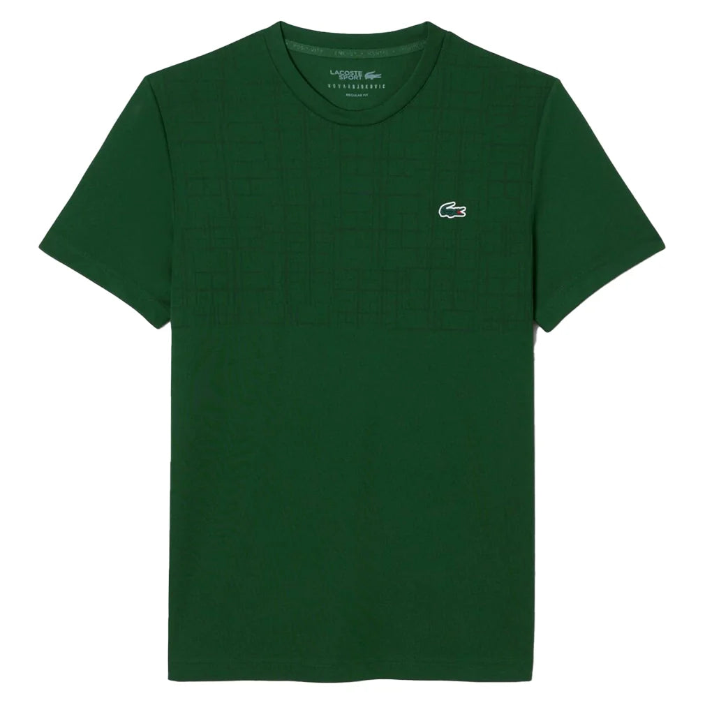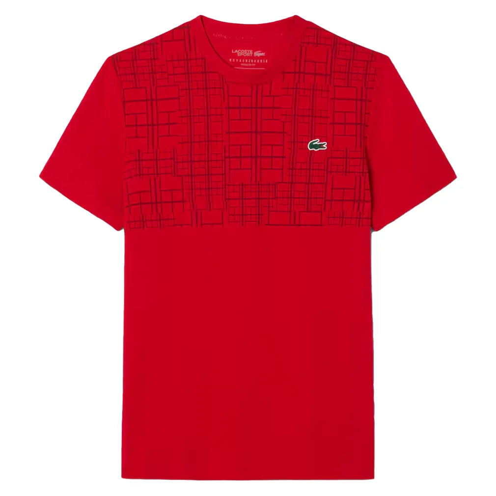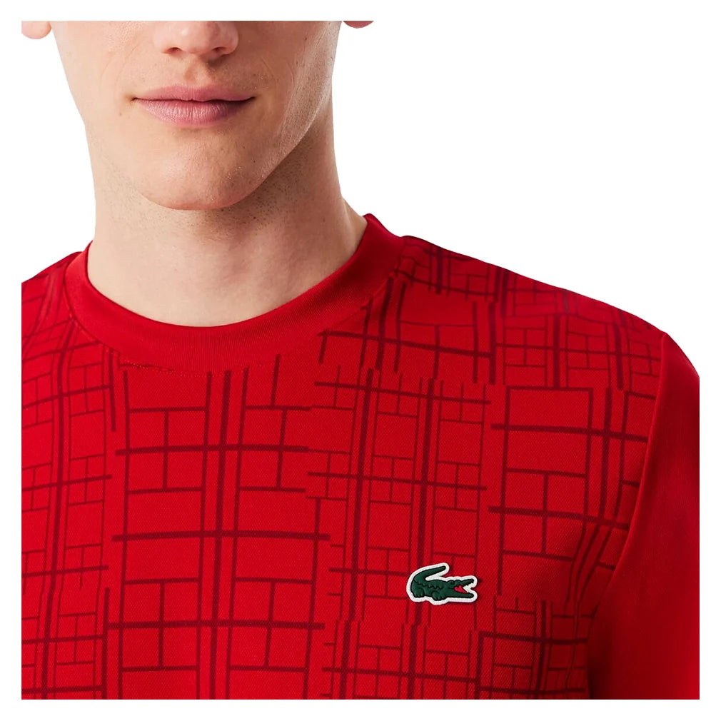 Turn up the heat with the Lacoste Men's Novak Djokovic Fan Tennis Top. This short-sleeved crew neck shirt is designed with an upper plaid pattern inspired by tennis racquet strings, merging style together with sport. Stay safe under the sun with the help of UPF 50+ rated sun-blocking fabrics that also have Ultra-Dry moisture-wicking properties to cool you down.