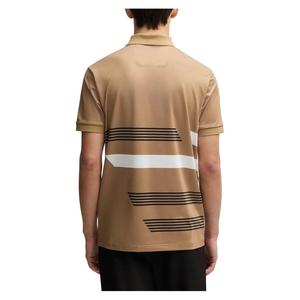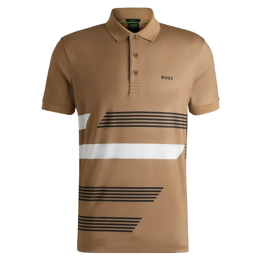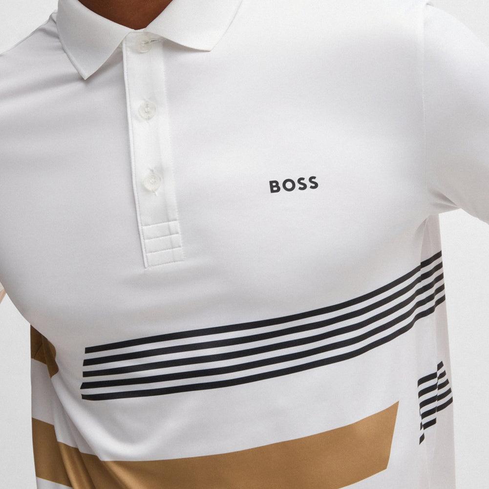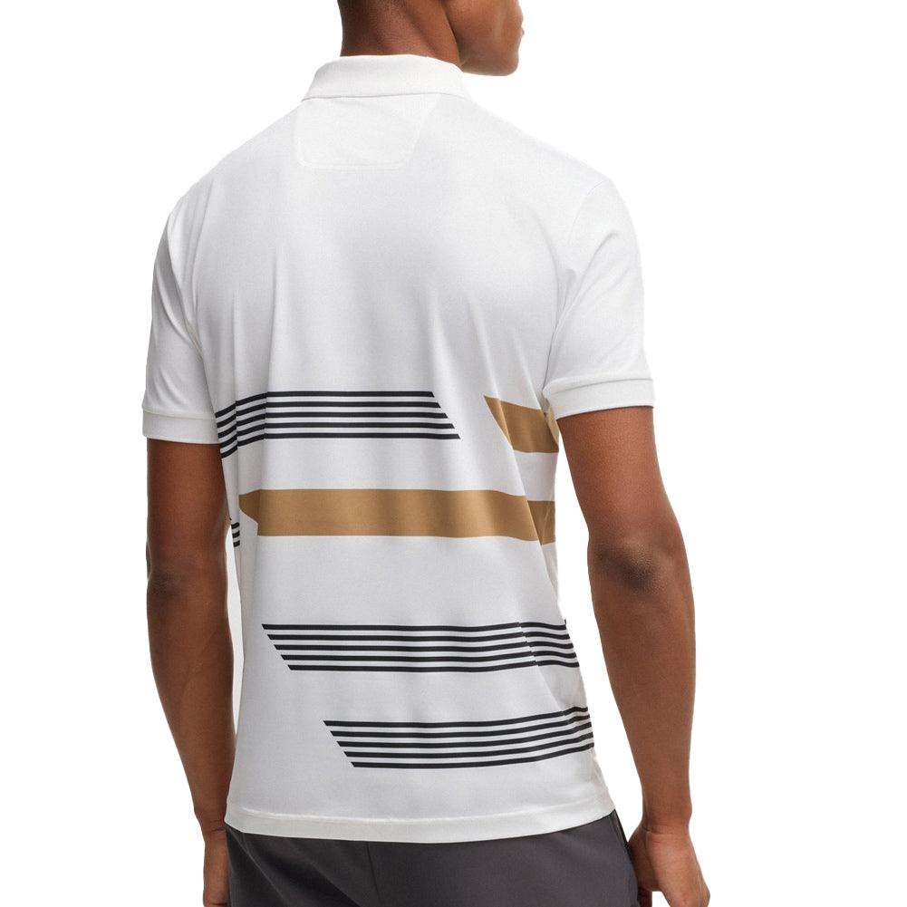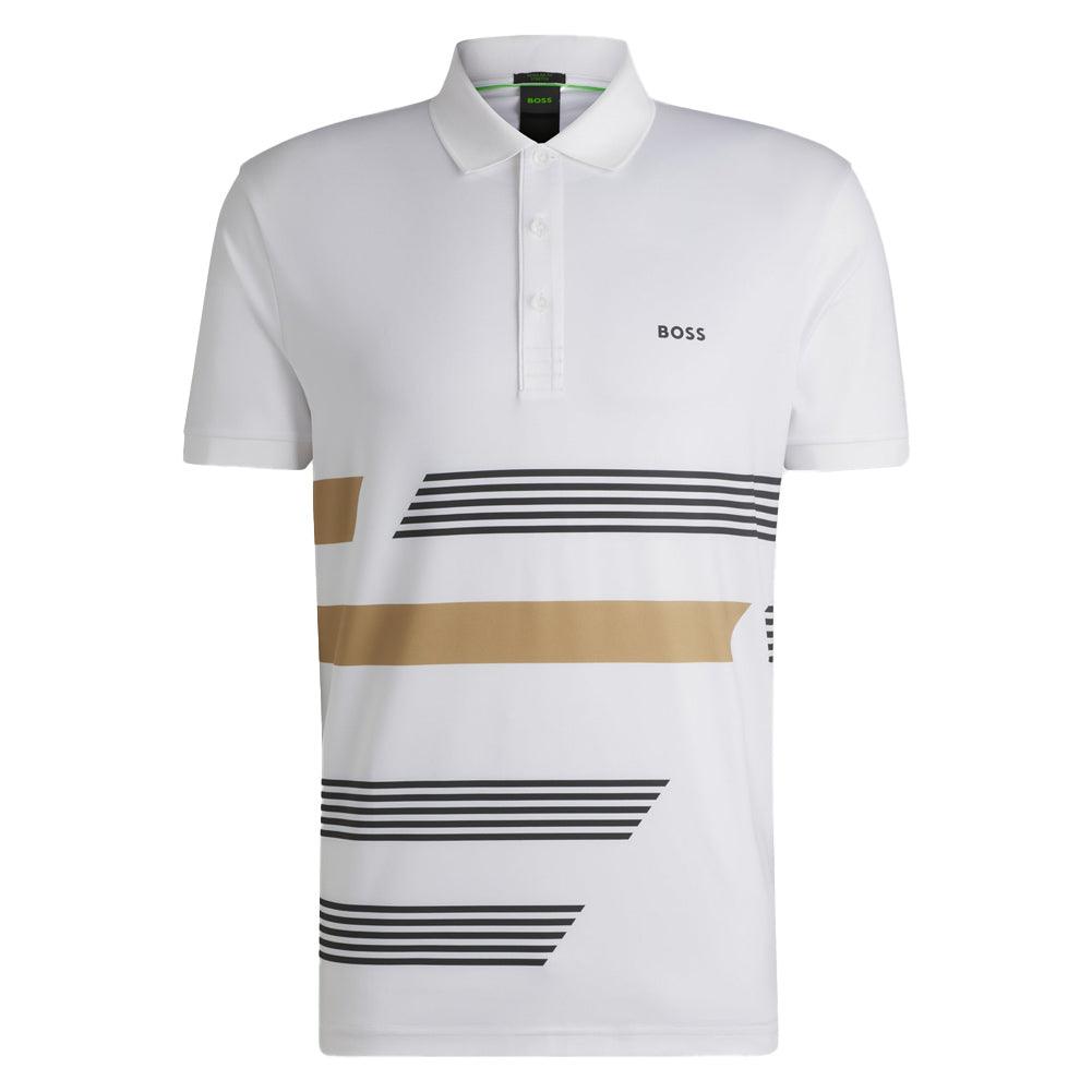 Earn your stripes with the BOSS Men's Paddy Tape Print Tennis Polo. Its jersey material is engineered with 4-way stretch for exceptional performance and comfort. Contrasting stripes across the body create a bold and dynamic sense of style. With the regular-fitting design and straight cut seams, you can enjoy a familiar-feeling shirt while giving it your best on the tennis courts.