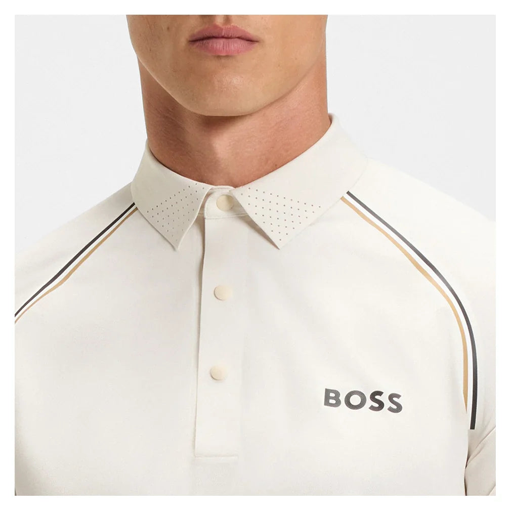 Step onto the court with confidence in the Hugo Boss Men's Patteo TOC Tennis Polo Black. This slim-fitting shirt is designed with perforated details on the collar for breathability and tailored with bonded seams for comfort. Moisture-wicking fabrics manage sweat for cooling relief on the court. The signature stripes along the shoulders create a retro-inspired look for timeless appeal.