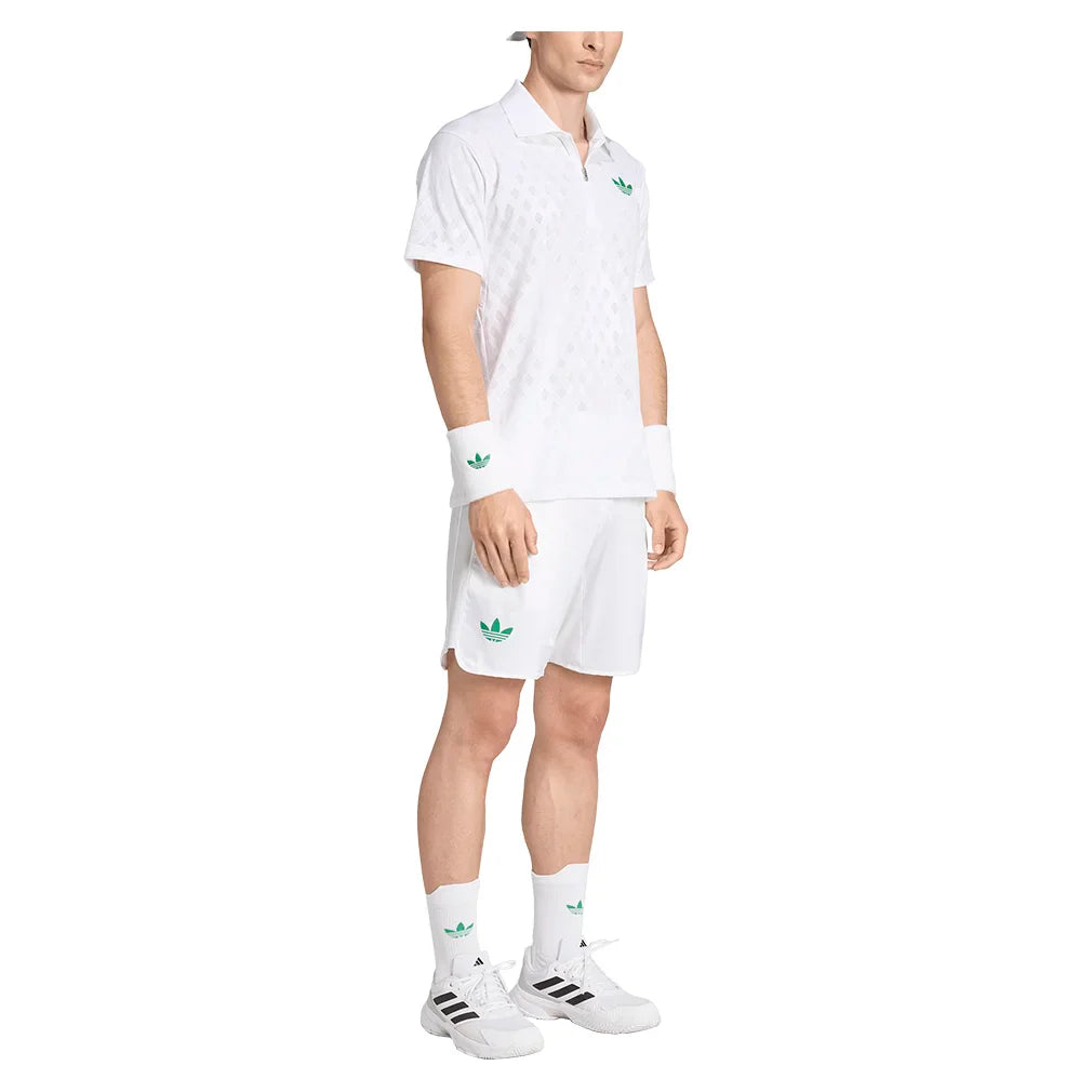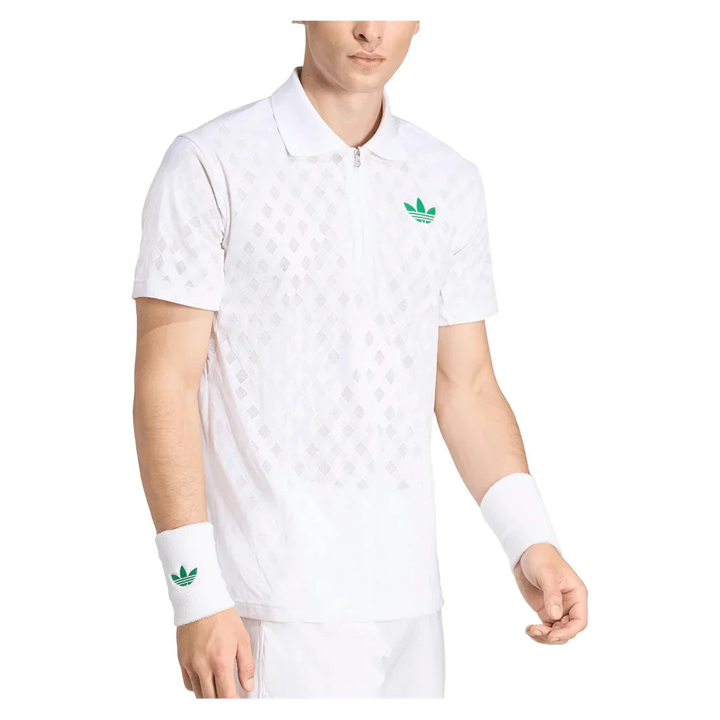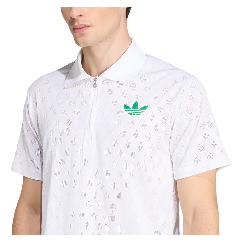 Step onto the court with championship confidence in the adidas Men's Pro Tennis Polo, engineered for professional tournament play at Wimbledon. This sophisticated polo showcases the legendary adidas trefoil logo in distinguished green, perfectly positioned on the chest to embody the prestige of Centre Court. The refined polo design features a classic collar and quarter-zip closure, delivering the polished aesthetic demanded by Wimbledon's dress code while maintaining the performance edge that pros require. An intricate textured diamond pattern throughout the fabric adds subtle visual interest while maintaining sophistication.