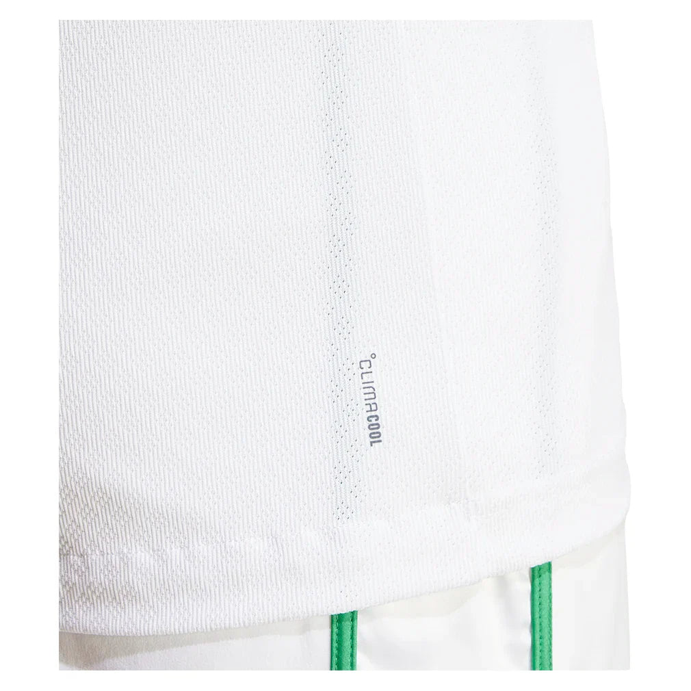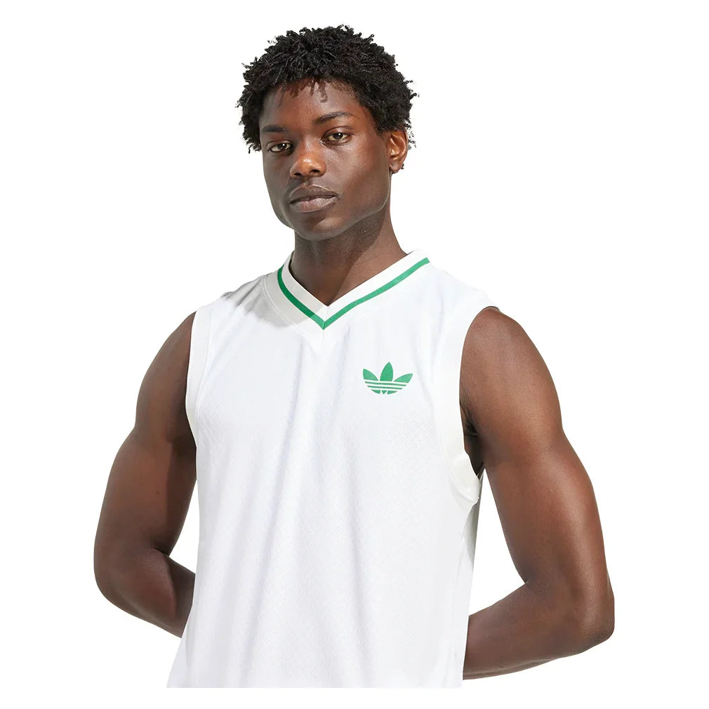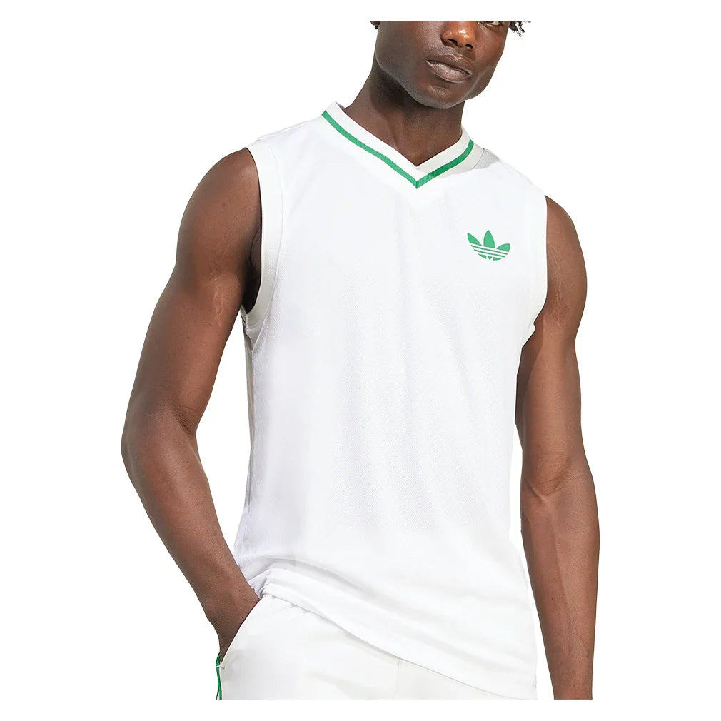 Gear up for grass court action with the adidas Men's Pro Tennis Tank Top. Designed with a v-neck collar with contrasting green trims, this athletic top exemplifies Wimbledon tradition by merging the traditions of both tennis whites and lawn court play. The classic trefoil logo makes its triumphant return to show adidas' strong sporting legacy.