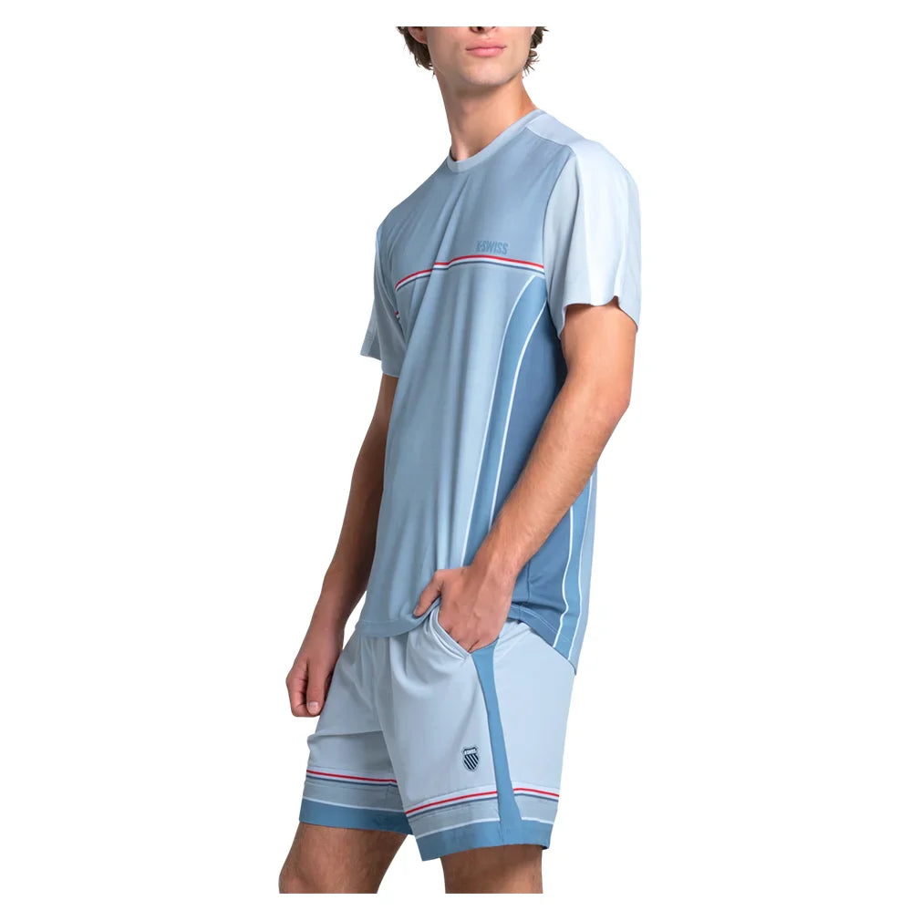 This is the K-Swiss Men’s Voyager Short Sleeve Tennis Top. This high-performance crew neck is designed for the modern athlete. Made from moisture-wicking jersey fabric, this tee keeps you dry, cool, and focused throughout every set. Bold color blocking and gradient retro stripes deliver a striking look that matches your competitive edge. Whether you're training or competing, this top combines style and performance for a winning combination.