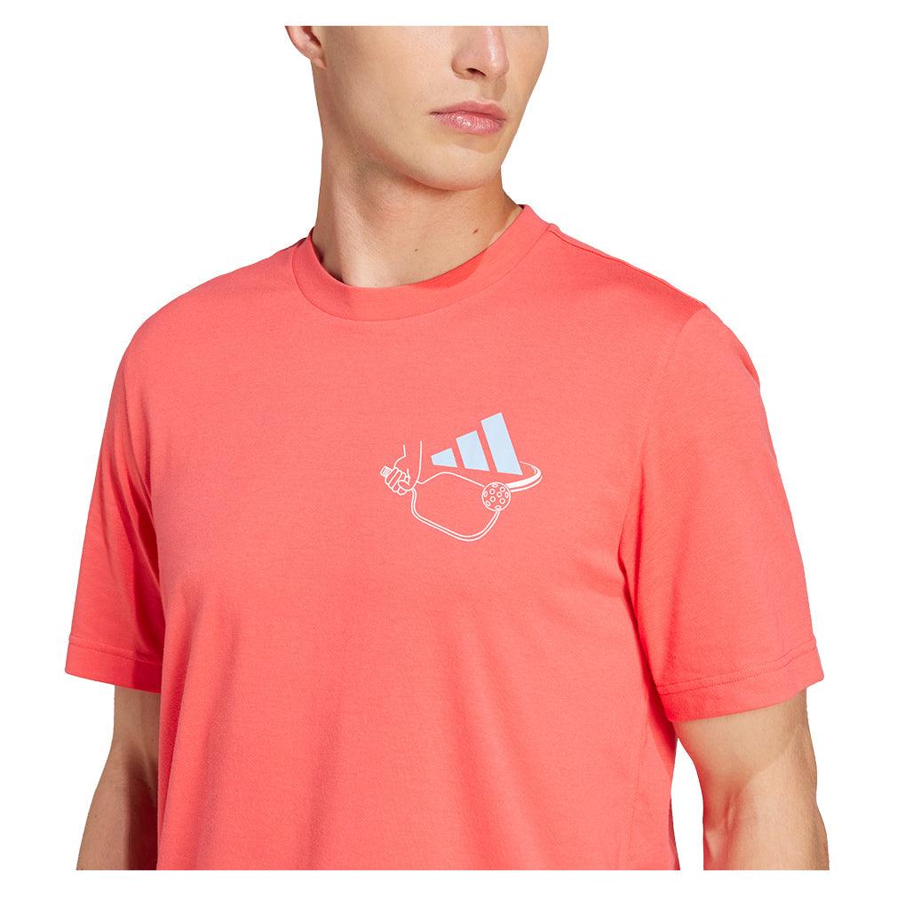 Make good memories with the adidas Men's Graphic Pickleball Top. Win or lose, what matters most is the fun you had. The back print depicts charcuterie presented on a pickleball paddle as part of a play on the words "Just Got Served." Its crew neck construction and smooth comfortable materials ensure you'll be in high spirits.