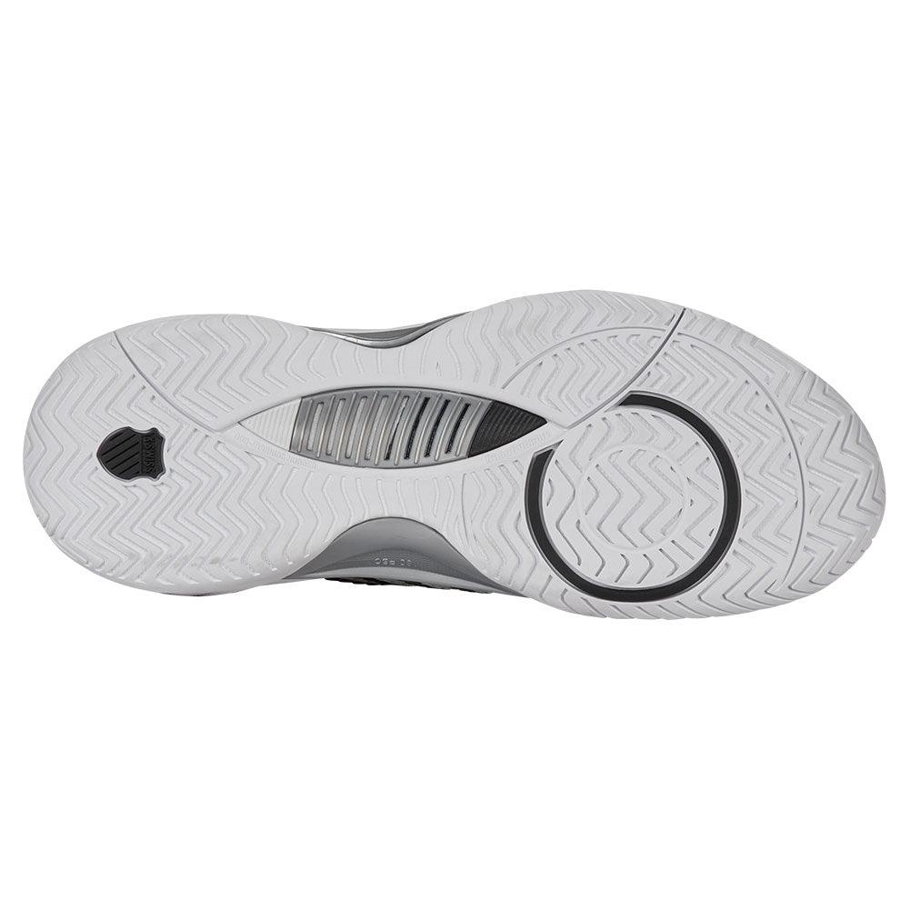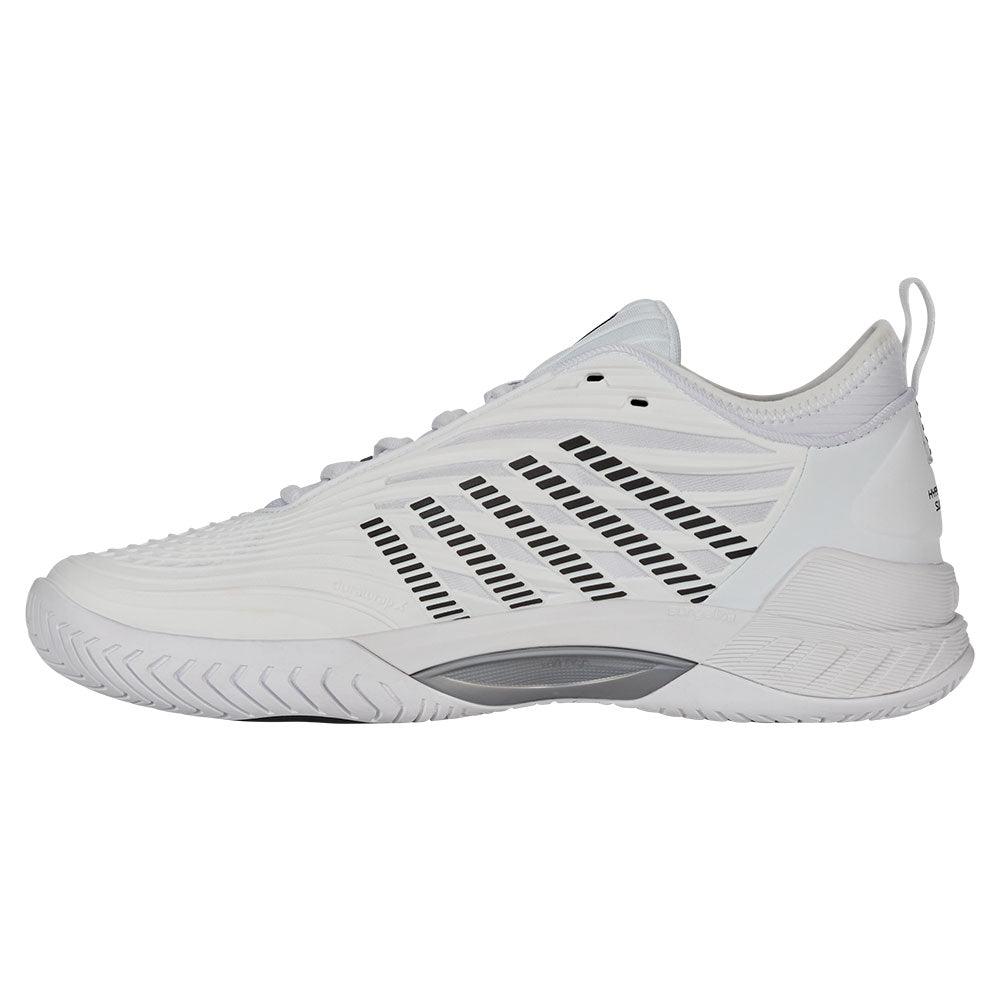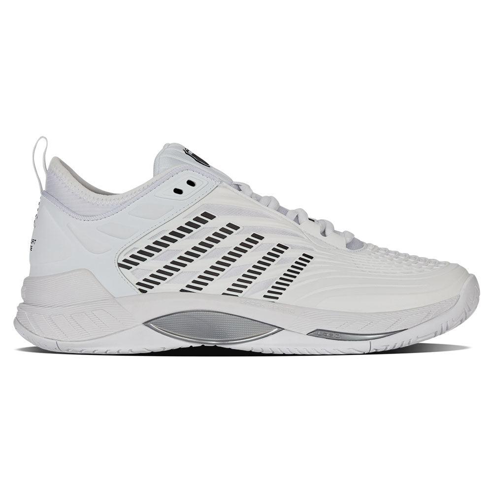 The K-Swiss Men's Hypercourt Supreme 2 Tennis Shoe is an update to one of K-Swiss's most popular tennis shoes. Key features are a more secure fit, increased support, and more outstanding durability while maintaining maximum comfort. The Durawrap X upper provides support and drag protection while keeping a flexible feel as you track down the next ball. The Dual-density midsole utilizes the lightweight Surgelite external foam for maximum comfort and support. A high rebound Shock Spring inner foam on the forefoot allows a quicker reaction in every step. The Dragguard 7.0 rubber outsole is formed into a modified herringbone tread pattern for traction and durability on all court surfaces. The newly engineered soft bootie collar gives a more secure fit around the ankle.