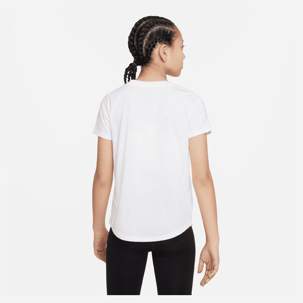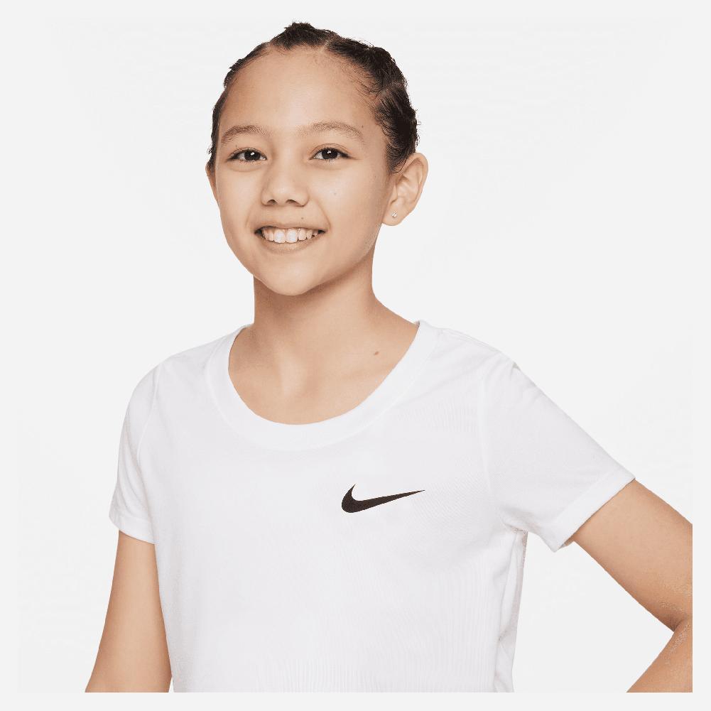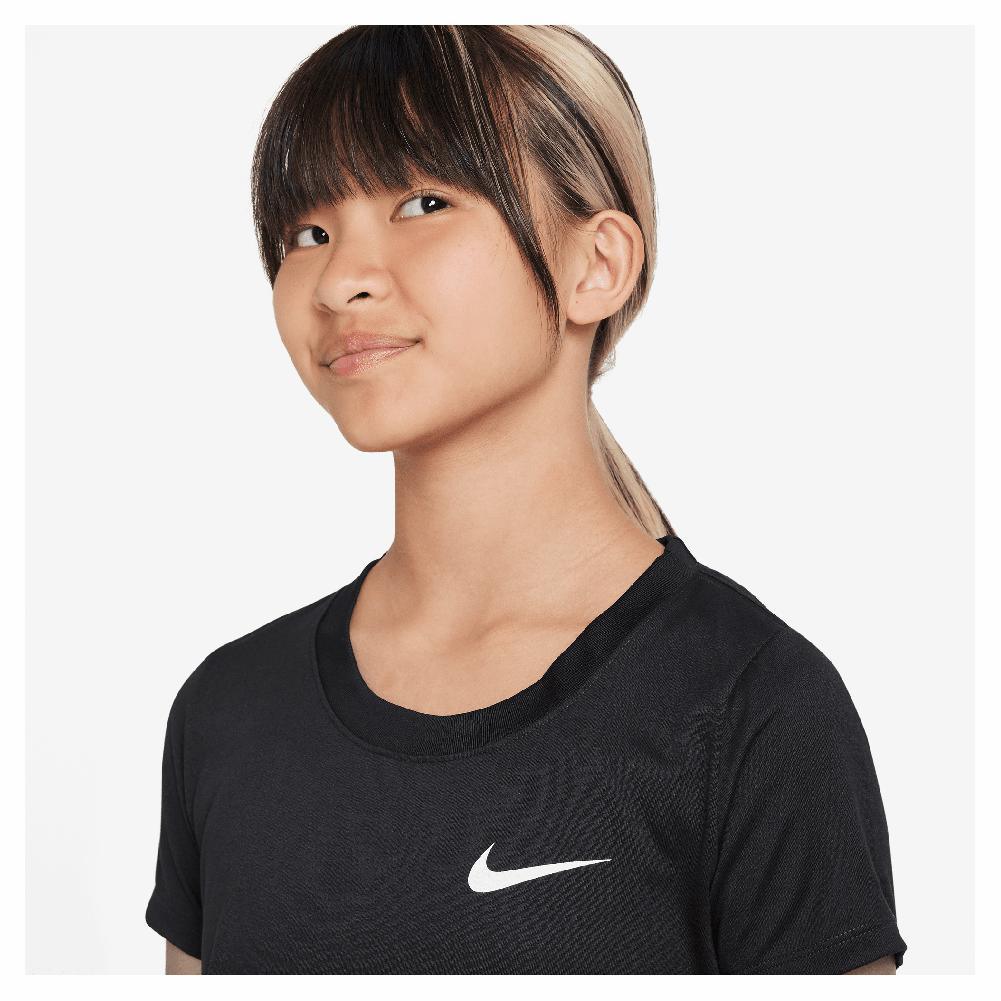 The NIKE Girls' Dri-FIT Training T-Shirt is perfect for whatever gets you moving. Play, practice and tennis match whatever it is, this tee keeps you dry and comfortable so you can do your best and have fun. It uses Nike's Dri-FIT technology to keep sweat away from your body so that you can focus on what matters most: having fun! The fabric is lightweight and breathable, so it feels like a classic t-shirt without feeling too loose or too slim. The ribbed collar stretches so you can easily pull the shirt on and off.