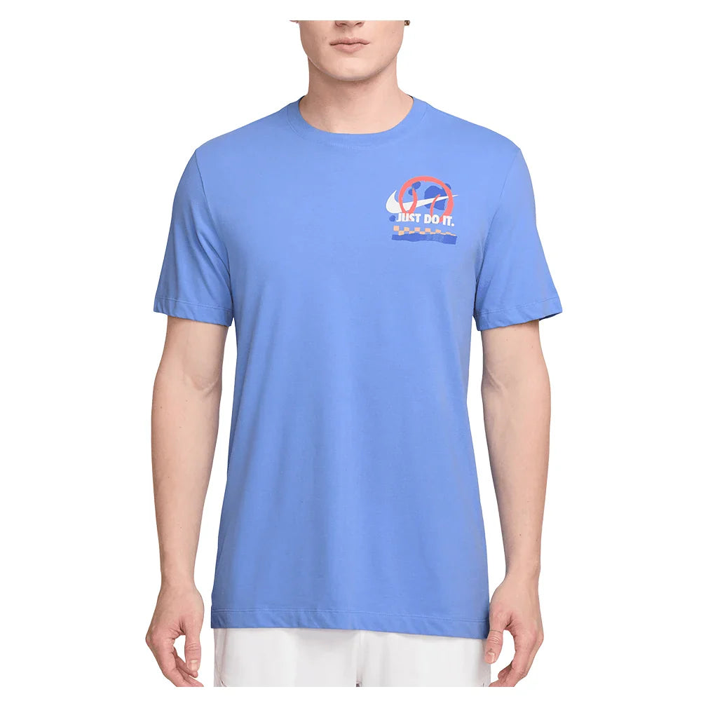 Show off your attitude with the Nike Mens Dri-Fit Tennis Top. This crew neck tee takes the iconic "Just Do It" motto to the next level with an eye-catching chest logo on the front side. Its backside features a slew of similar tennis-related mottos to motivate players to do their best. The blended fabrics offer a soft and comfortable feel while Dri-Fit technology wicks away sweat for fast-drying relief.
